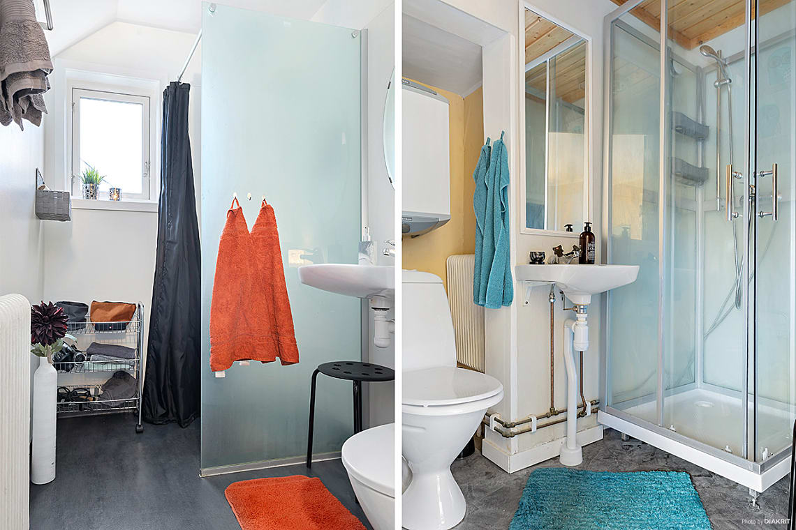 Här finns handfat, wc och duschkabin. Plastmatta på golv och målade väggar.