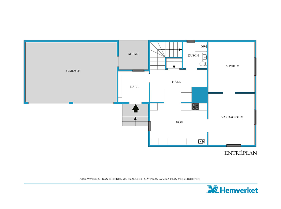 Entréplanet rymmer ett inbjudande kök med plats för det stora matbordet, perfekt för gemensamma middagar och umgänge. Här finns även ett ljust vardagsrum med gott om plats för soffgrupp, ett sovrum samt ett badrum.