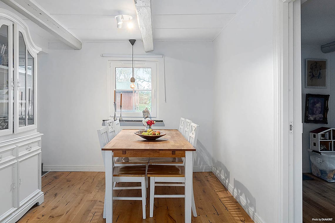 Den stora, lummiga och parkliknande trädgården ramas in av grönska och erbjuder gott om plats för både lek, odling och vila. Här växer äppelträd, päron, körsbär, plommon, hallon och vindruvor – en sann trädgårdsdröm. Invändigt pryds taket av vackra, synliga takbjälkar som ger hemmet en varm och rustik känsla.