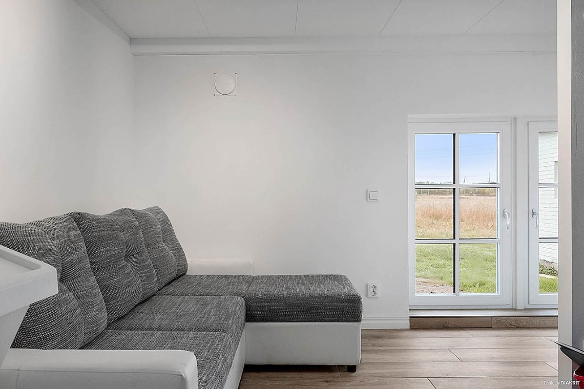 I öppen planlösning mot köket ligger vardagsrummet, inrett i samma harmoniska färgtoner. Här finns plats för soffgrupp och tillhörande möbler.