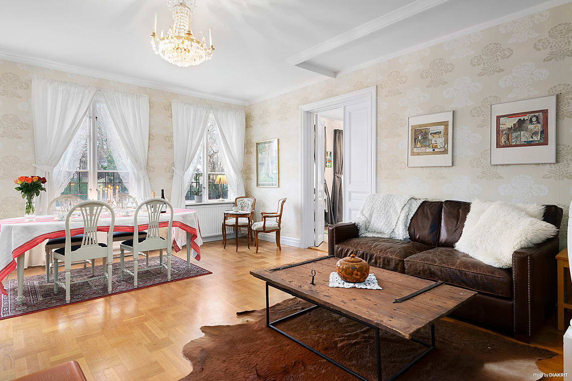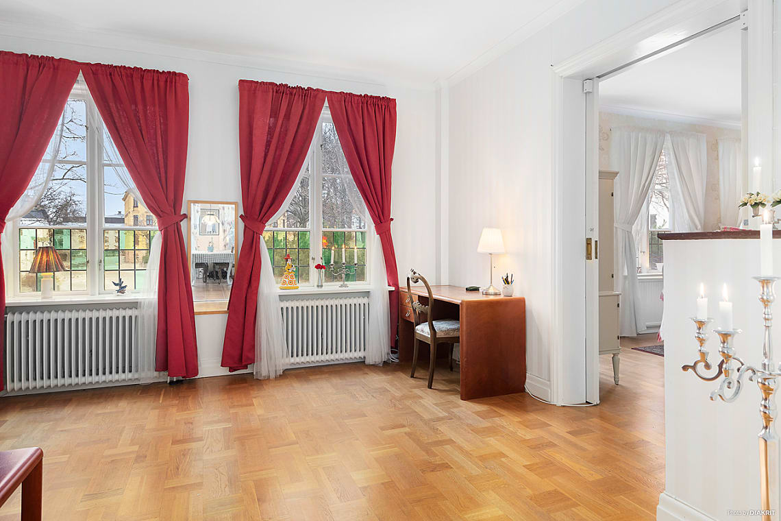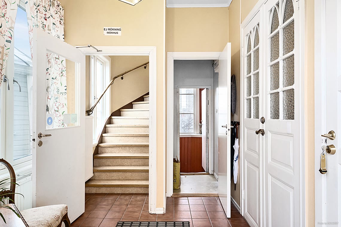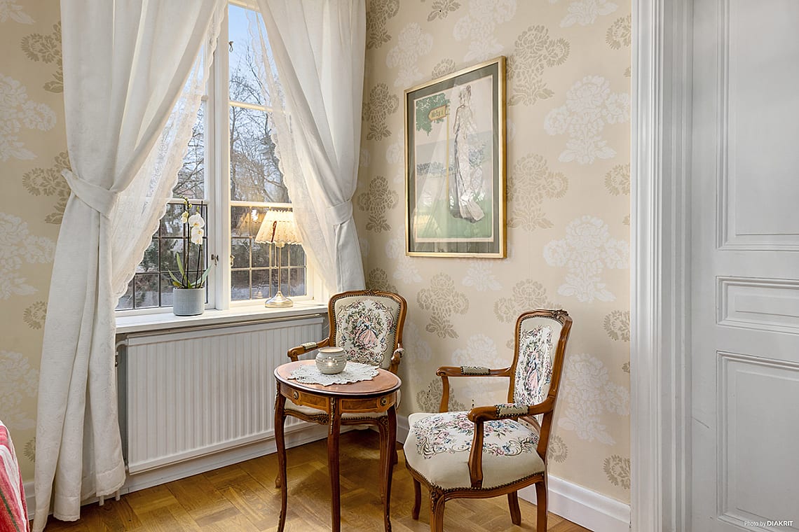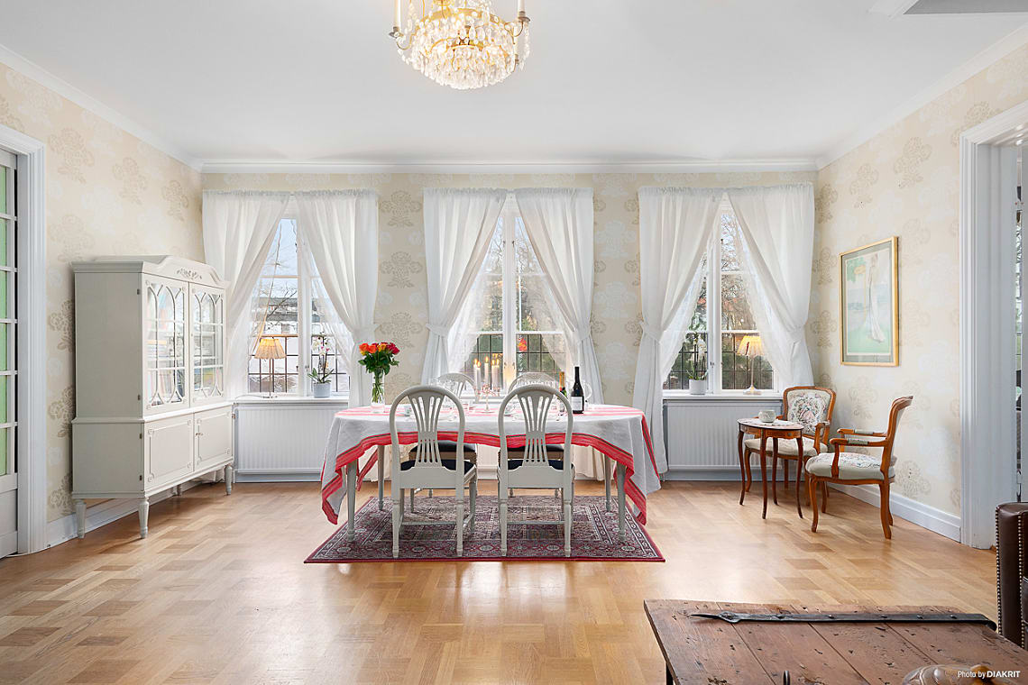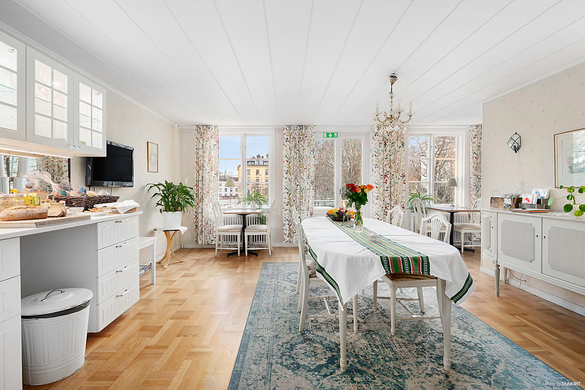 Byggnaden erbjuder en privat bostadsdel och fyra gästrum, samtliga med egna anslutande badrum, vilket skapar en genomtänkt och bekväm upplevelse för besökare. De generösa sällskapsytorna pryds av stora vackra fönster som släpper in rikligt med ljus, och de klassiska detaljerna, som spegeldörrar och vackra golv, ger hela huset en tidlöst elegant karaktär.