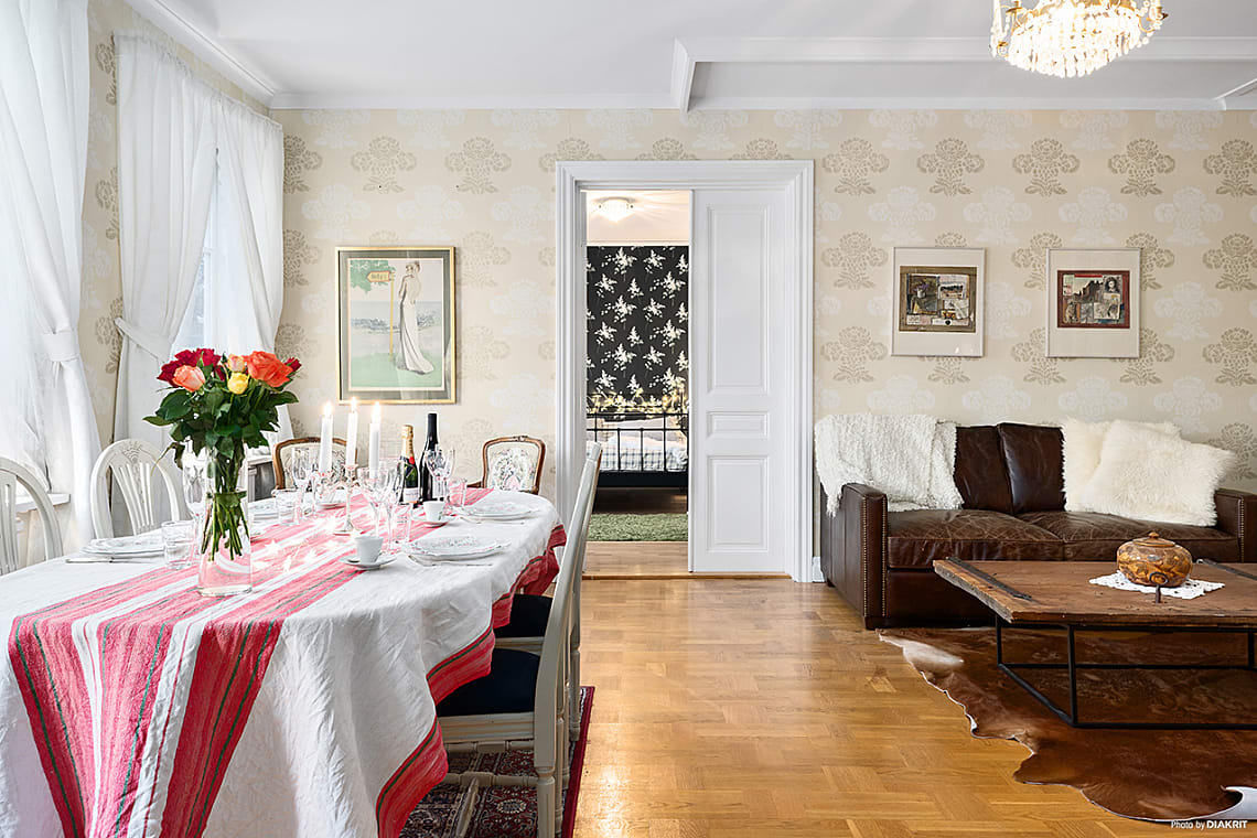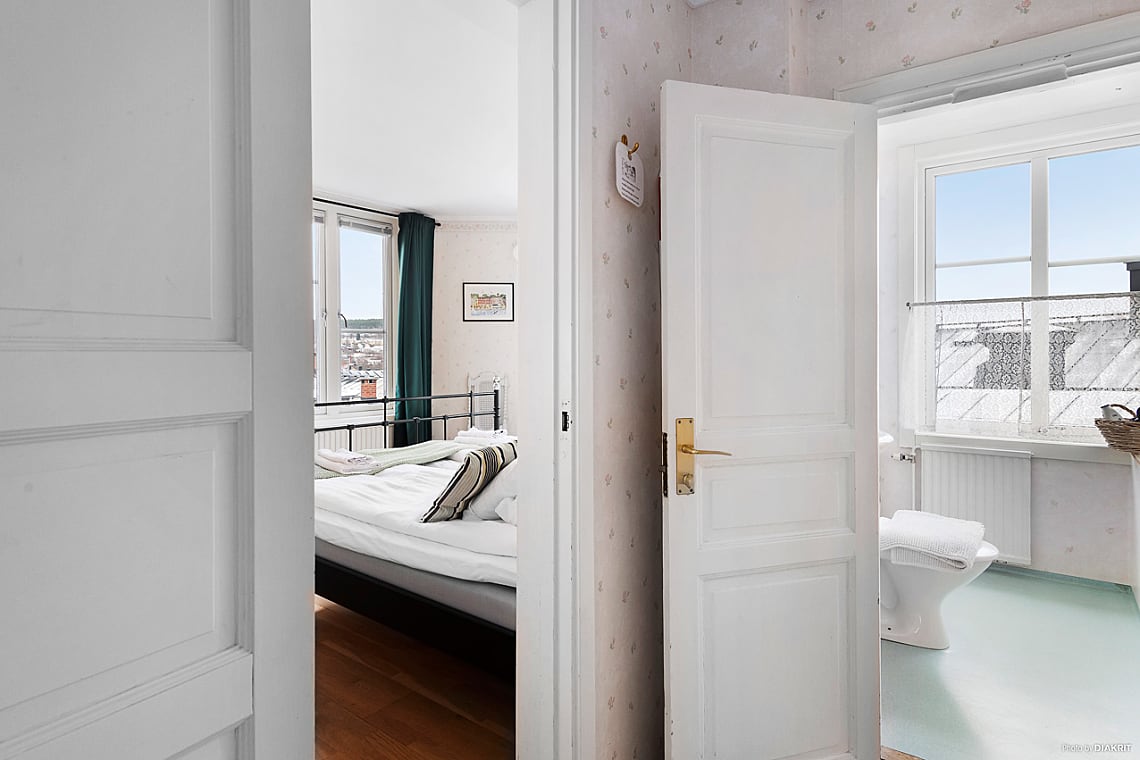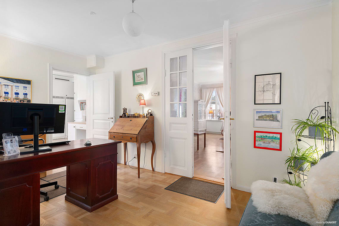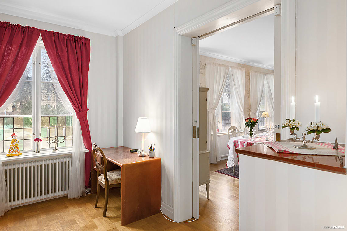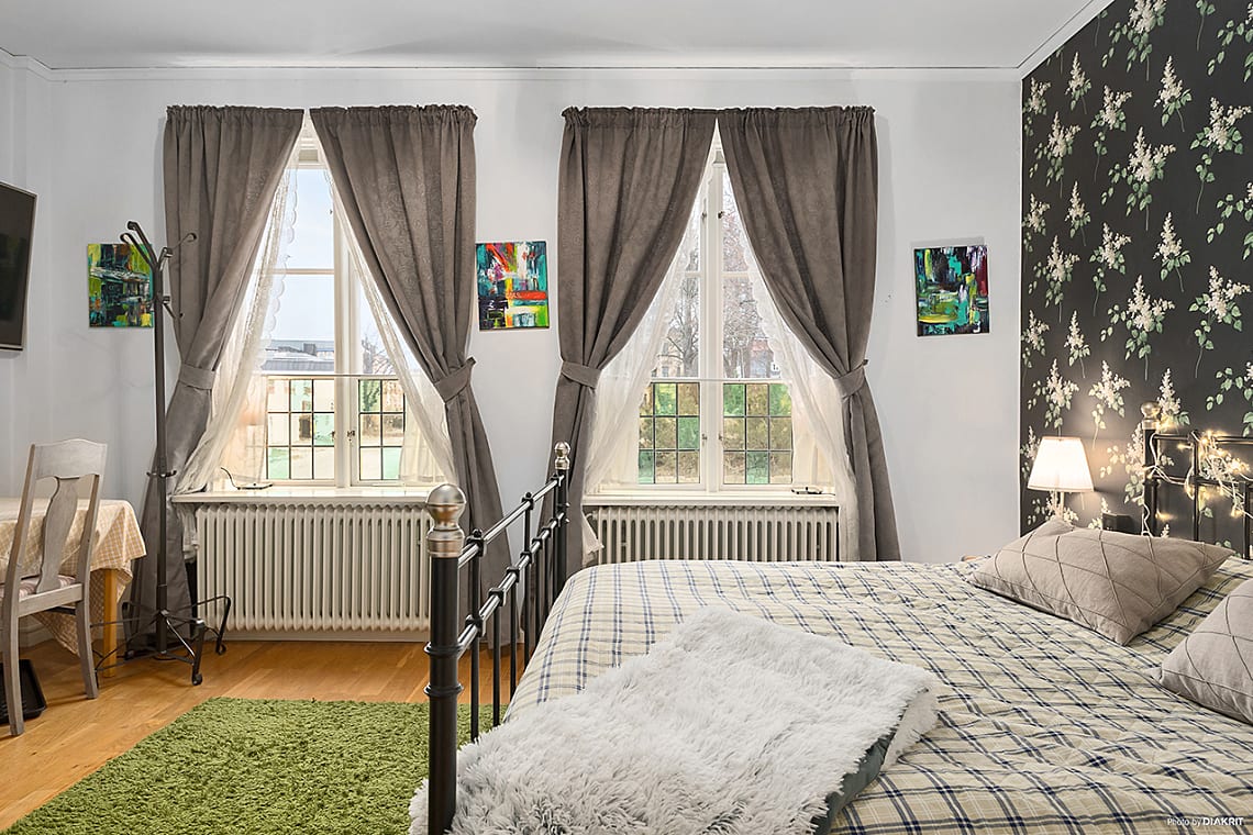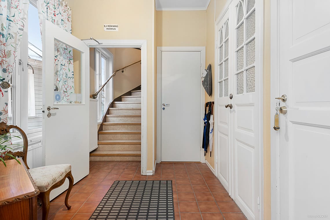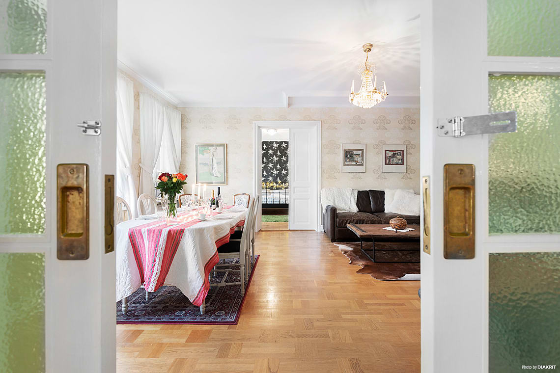 Byggnaden erbjuder en privat bostadsdel och fyra gästrum, samtliga med egna anslutande badrum, vilket skapar en genomtänkt och bekväm upplevelse för besökare. De generösa sällskapsytorna pryds av stora vackra fönster som släpper in rikligt med ljus, och de klassiska detaljerna, som spegeldörrar och vackra golv, ger hela huset en tidlöst elegant karaktär.