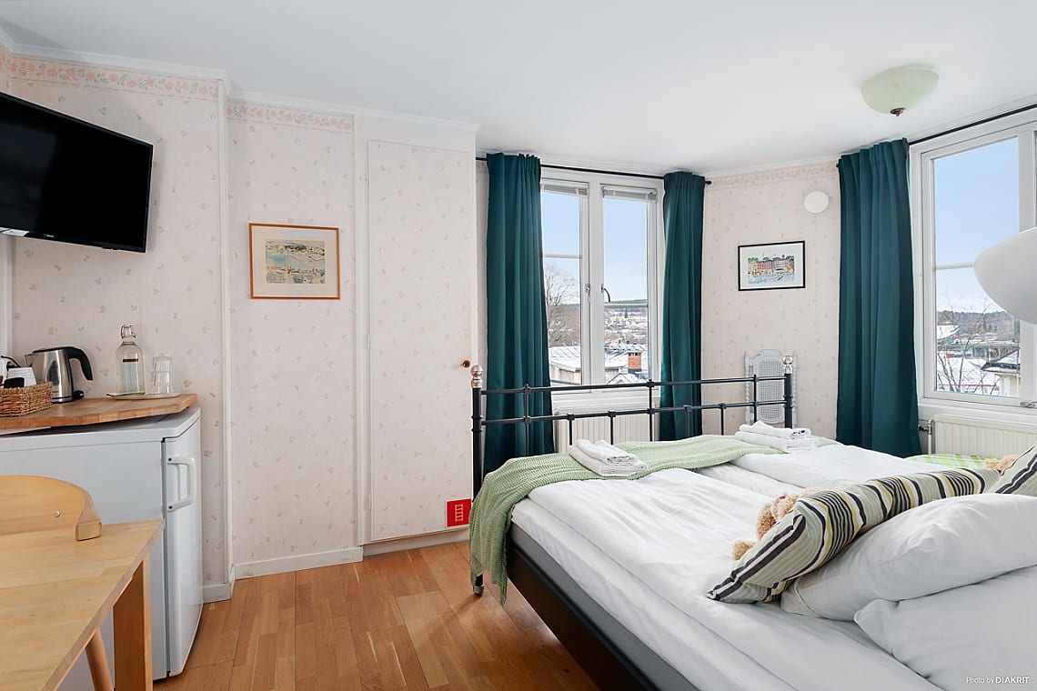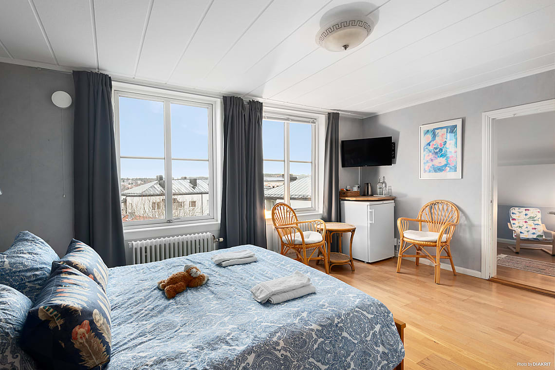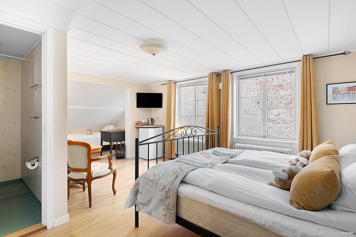 Övre plan erbjuder ytterligare tre gästrum, ett dubbelrum med anslutande badrum samt två trivsamma familjerum med alkov och egna badrum. På detta plan finns även ett praktiskt kök och ett charmigt allrum som idag används som en inbjudande frukostmatsal för gästerna.