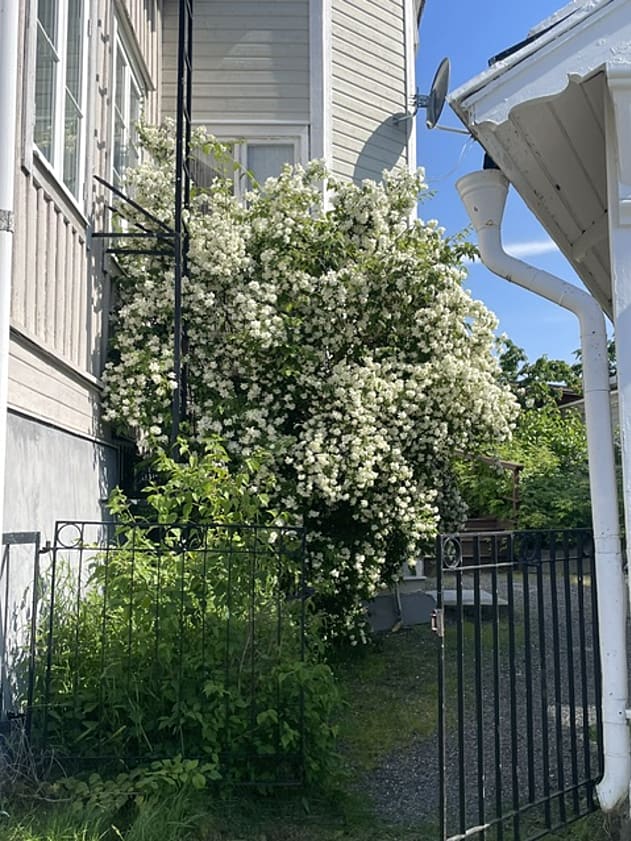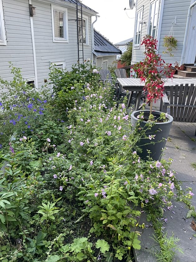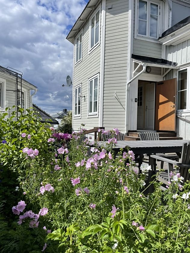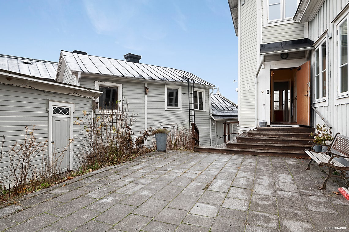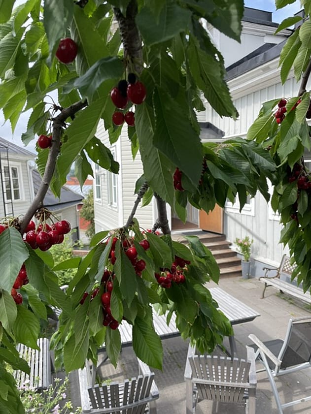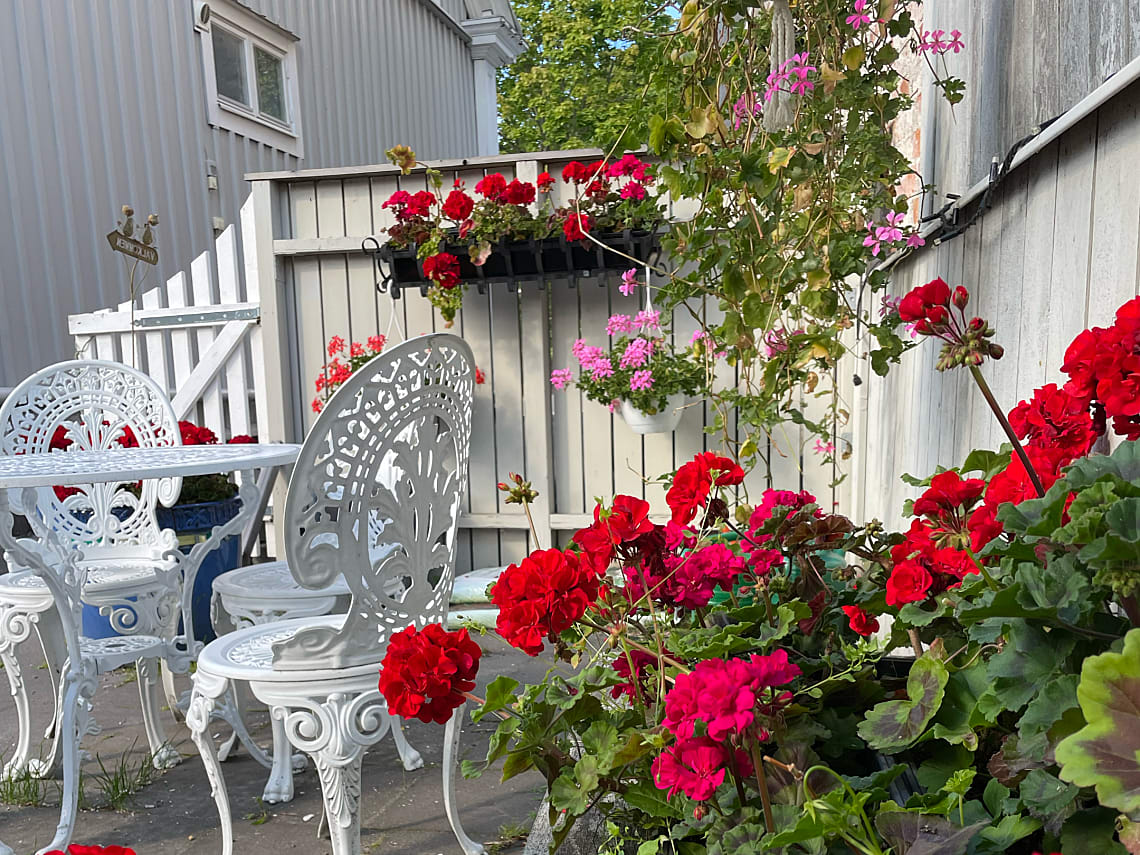 Den inramade gården med planteringar och ett prunkande bigarråträd skapar en lugn och trivsam miljö som uppskattas av både gäster och ägare. Fyra parkeringsplatser ger extra bekvämlighet och goda parkeringsmöjligheter för både gäster och besökare.