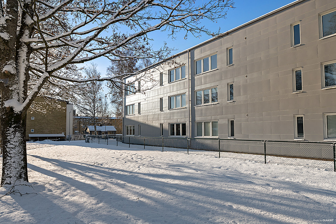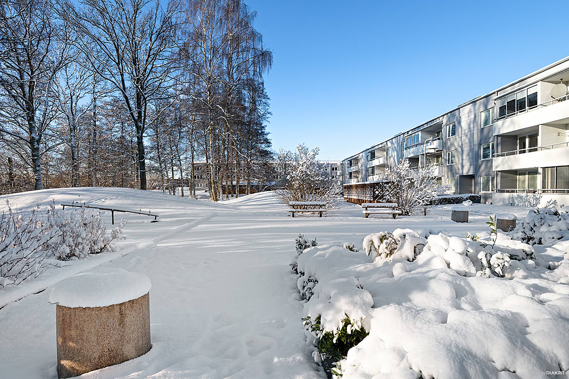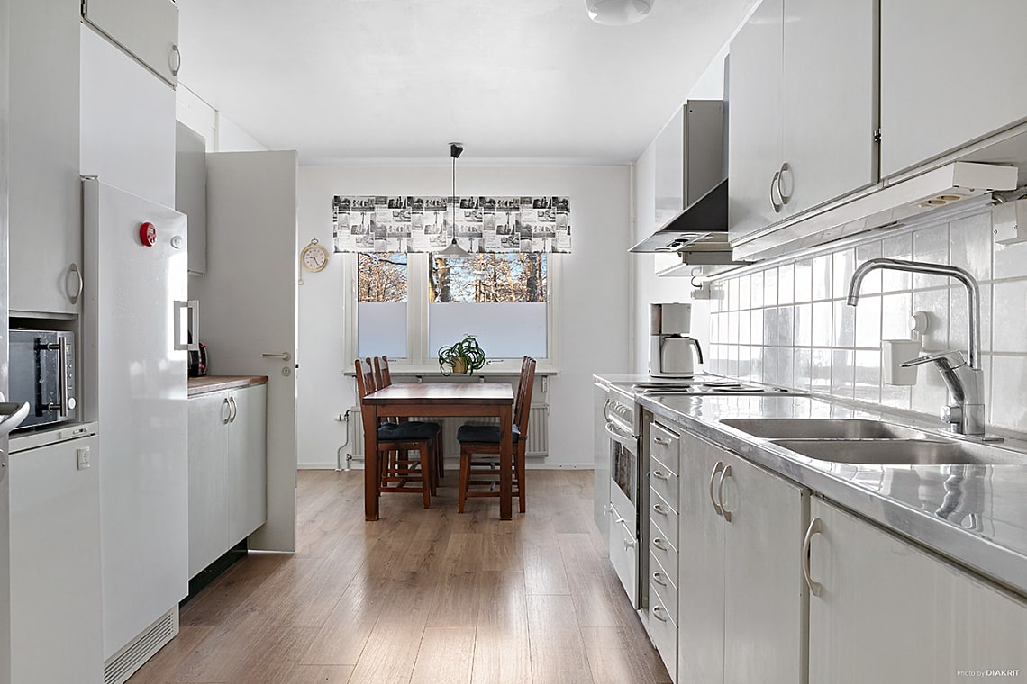 Det funktionella arbetsköket är utrustat med bra förvaring och arbetsytor. I det rofyllda sovrummet finns utgång till lägenhetens balkong, en härlig plats för morgonkaffet eller kvällens avkoppling. Badrummet är utrustat med tvättmaskin, vilket ger ytterligare bekvämlighet i vardagen.