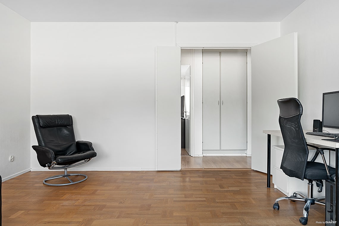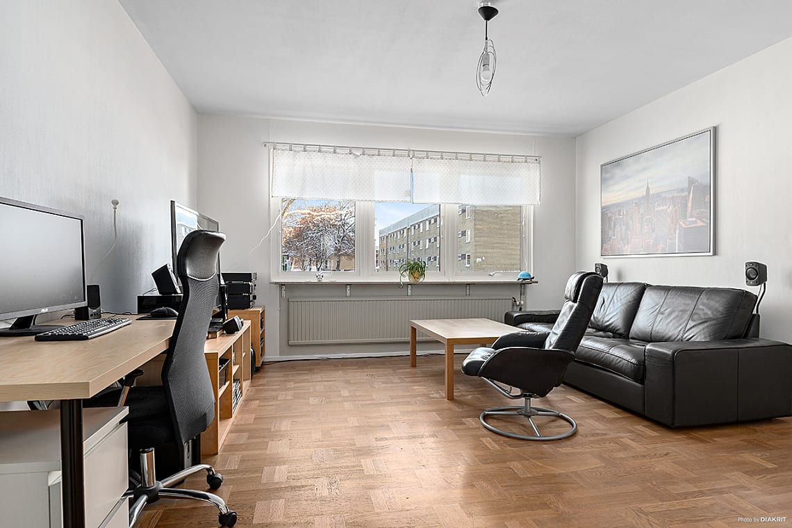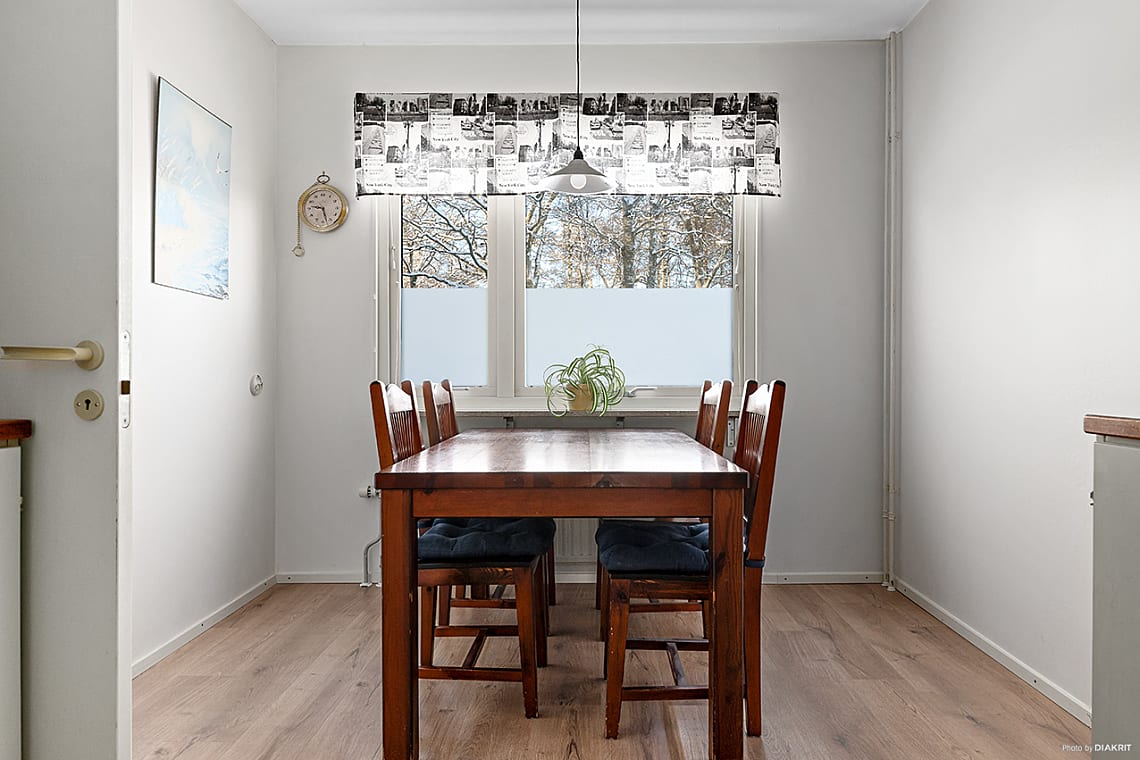 Lägenheten har en genomtänkt planlösning där varje yta används på ett praktiskt sätt. Det rymliga vardagsrummet erbjuder gott om plats för både soffgrupp och matsalsbord och har ett fint ljusinsläpp.