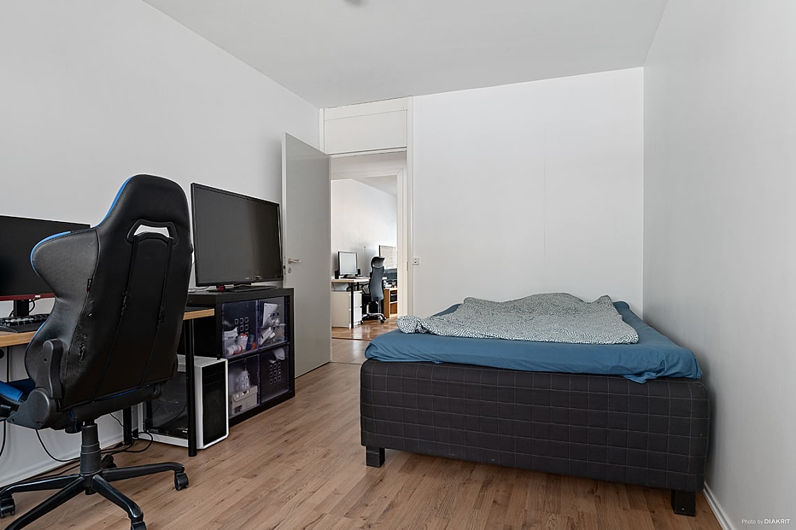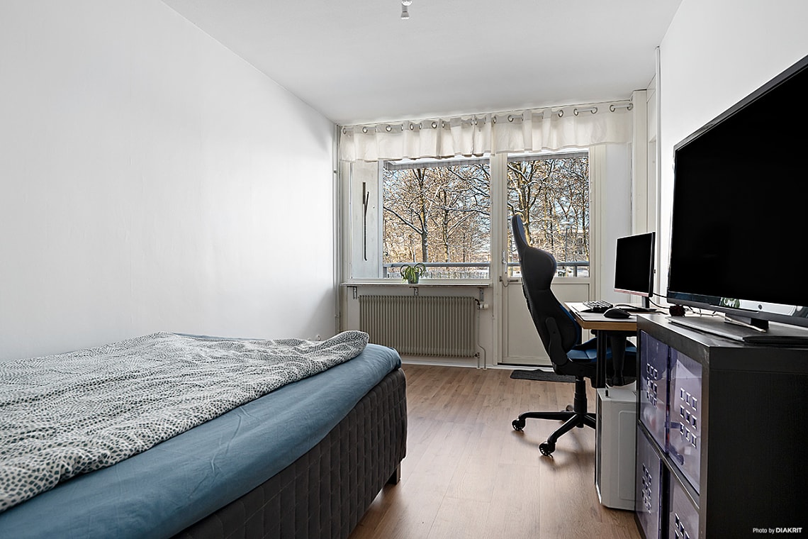 Sovrum av bra storlek med plats för säng med tillhörande sängbord och förvaringsmöbel. Nylagt tarkettgolv.