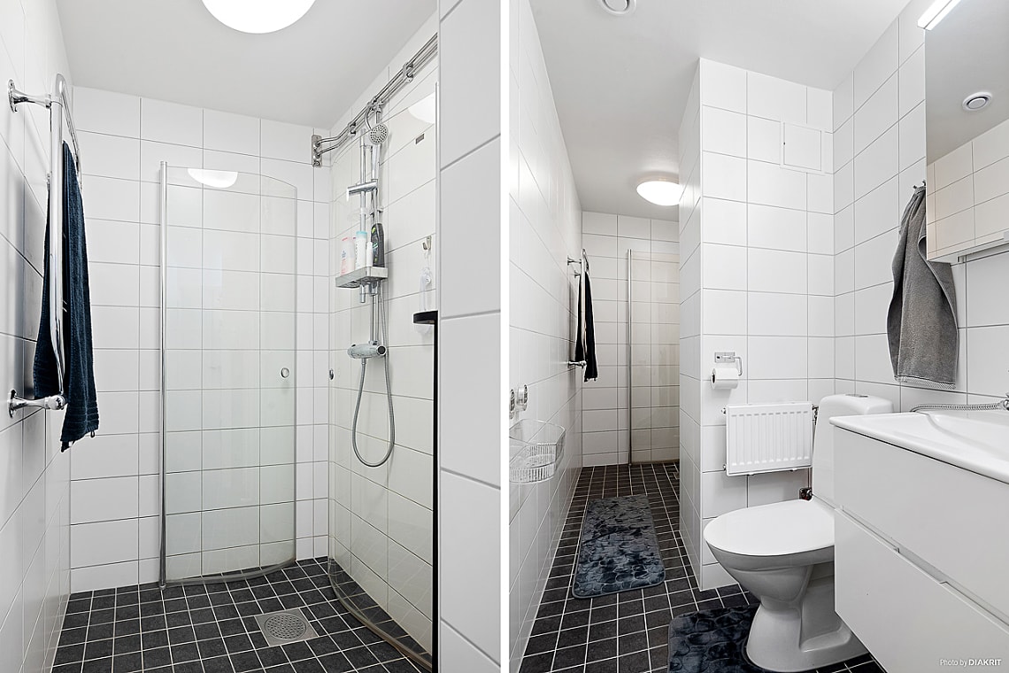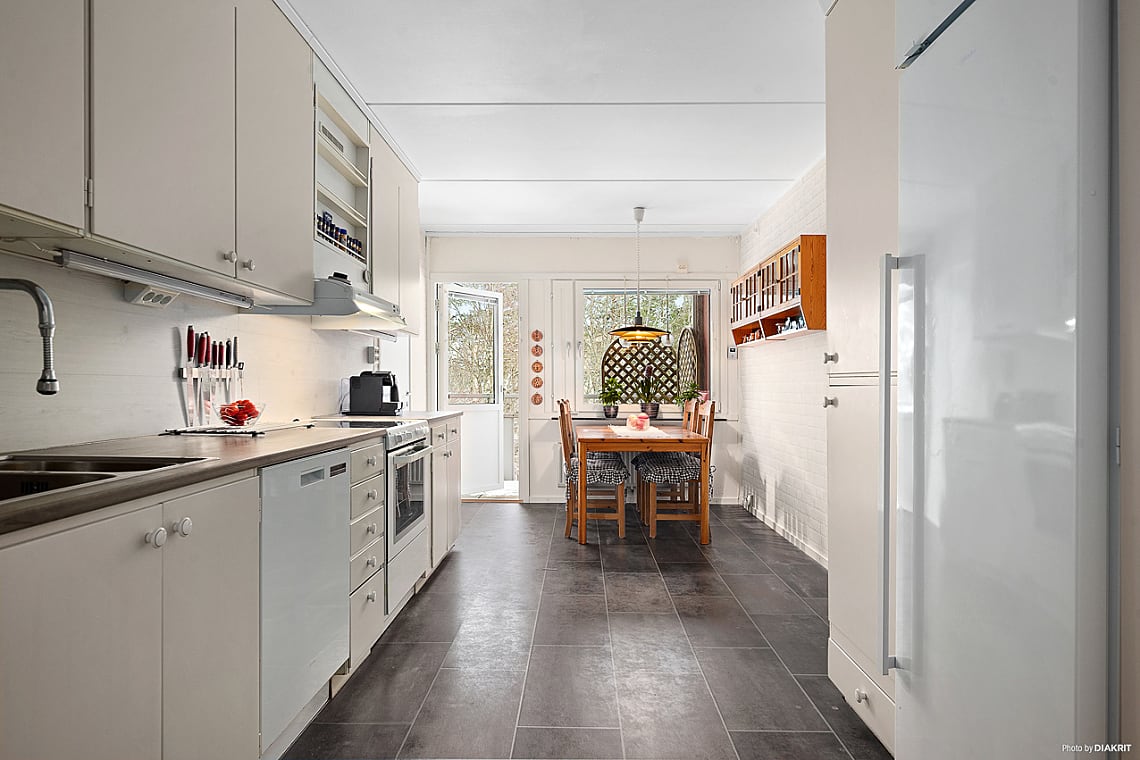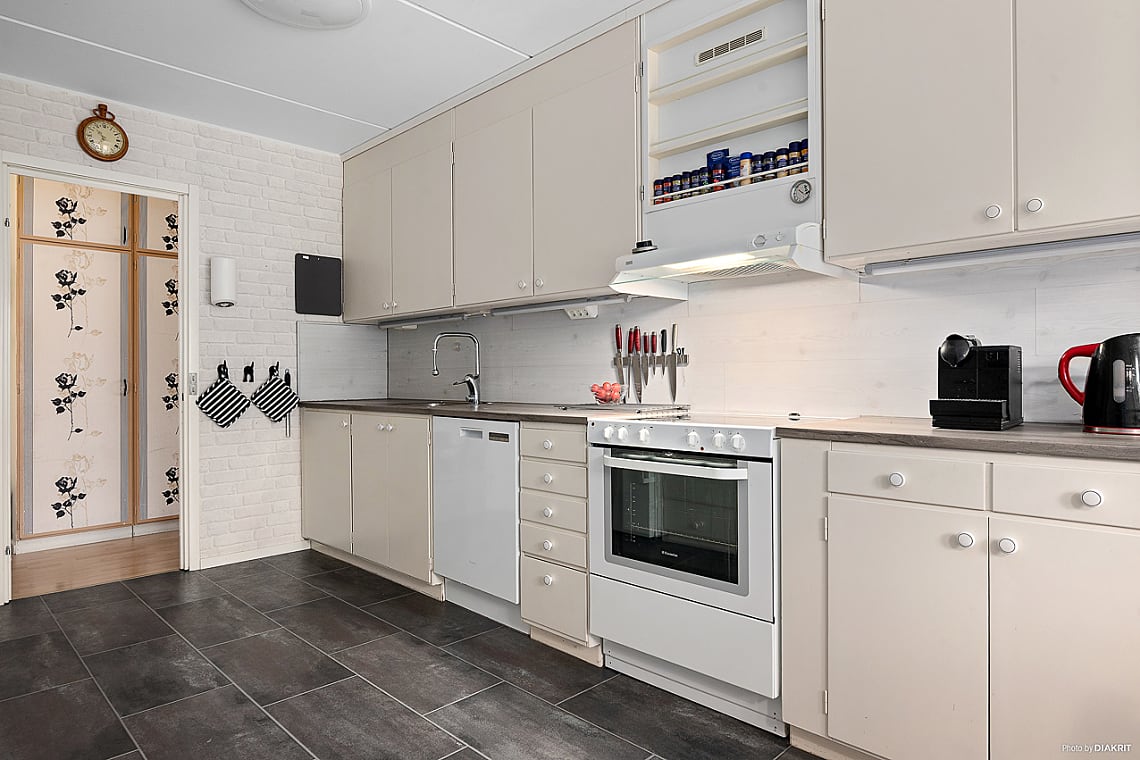 Bra arbetskök med goda förvaringsmöjligheter bakom ljusa släta luckor och gott om arbetsyta. Matplats intill fönster där du även når bostadens inbjudande balkong. Köket är utrustat med ugn med spishäll, fläkt, diskmaskin samt kylskåp.