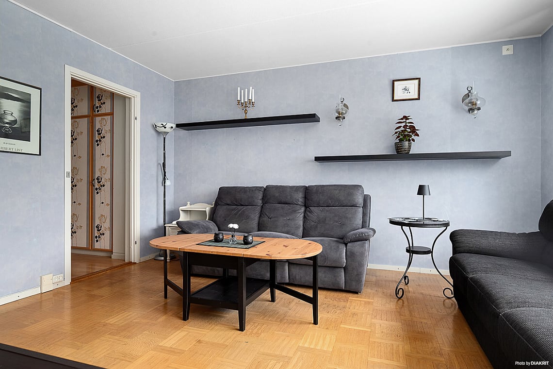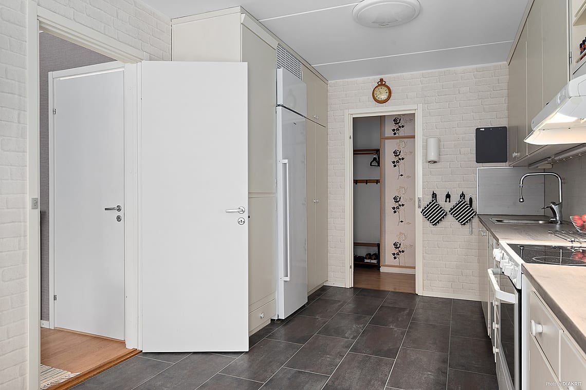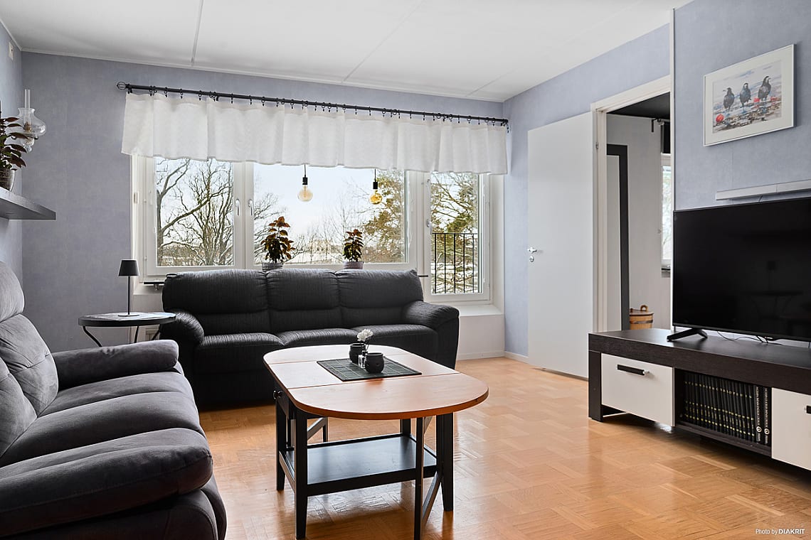 Det ljusa och inbjudande vardagsrummet har gott om plats för soffgrupp. Köket är praktiskt utformat med bra arbetsytor och förvaring samt utgång till balkong, en perfekt plats för morgonkaffet eller avkoppling under sommarhalvåret. Innanför köket finns ett grovkök med förberett för tvättmaskin, vilket ger extra bekvämlighet och funktion.