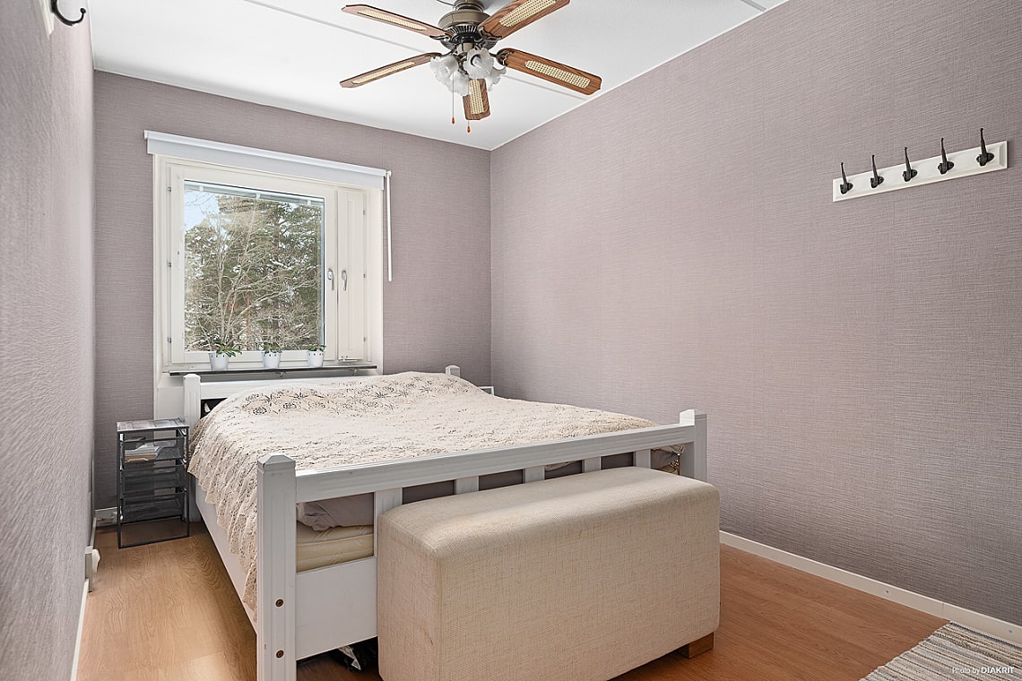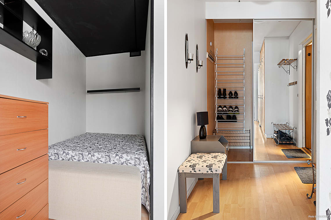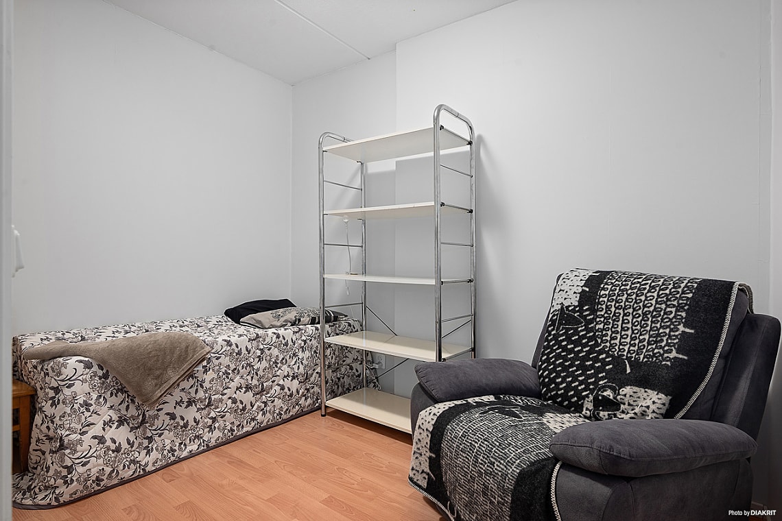 Rum med plats för säng och förvaringsmöbel.