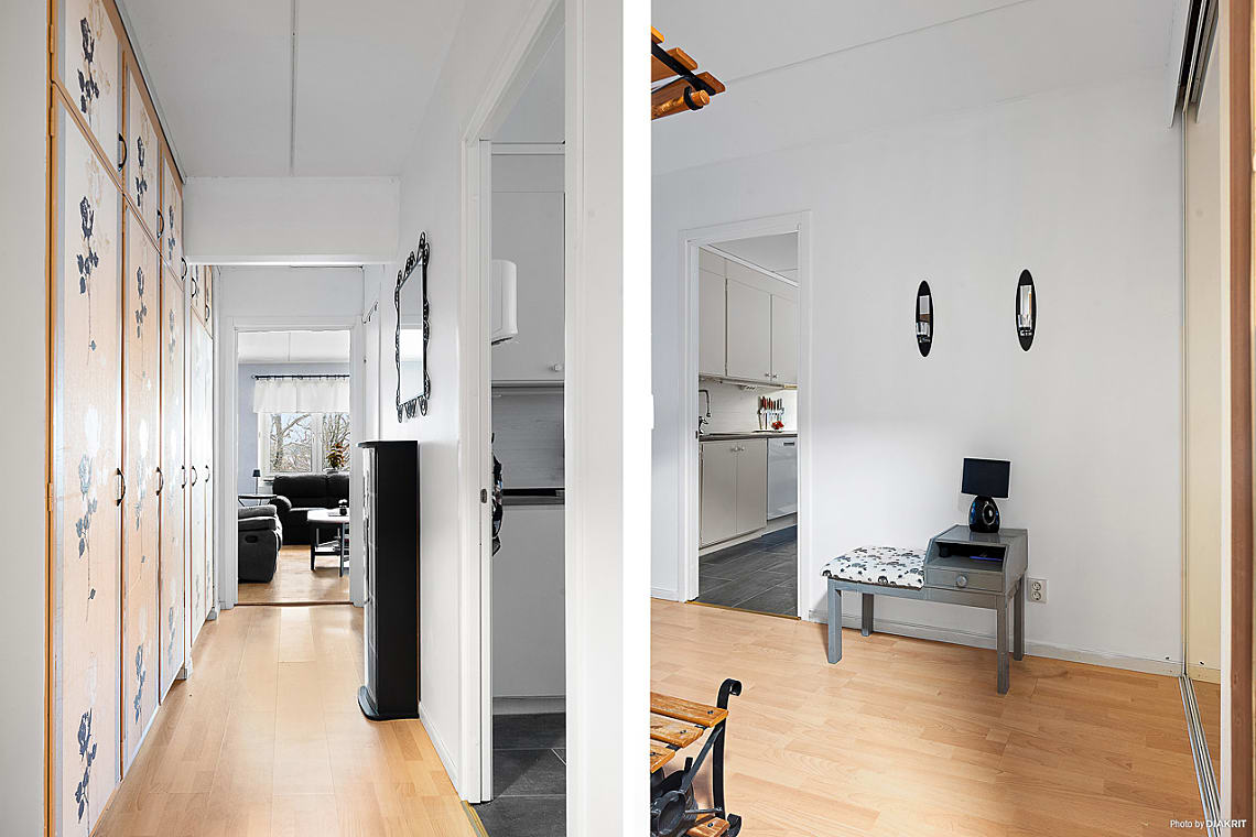 Välkomnande hall med plats för avhängning av ytterkläder och skor. Inbyggda garderober.