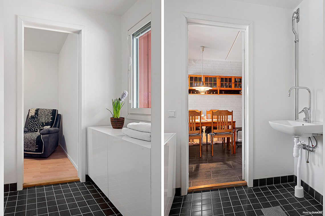 Innanför köket finns ett grovkök med handfat och förberett för tvättmaskin.