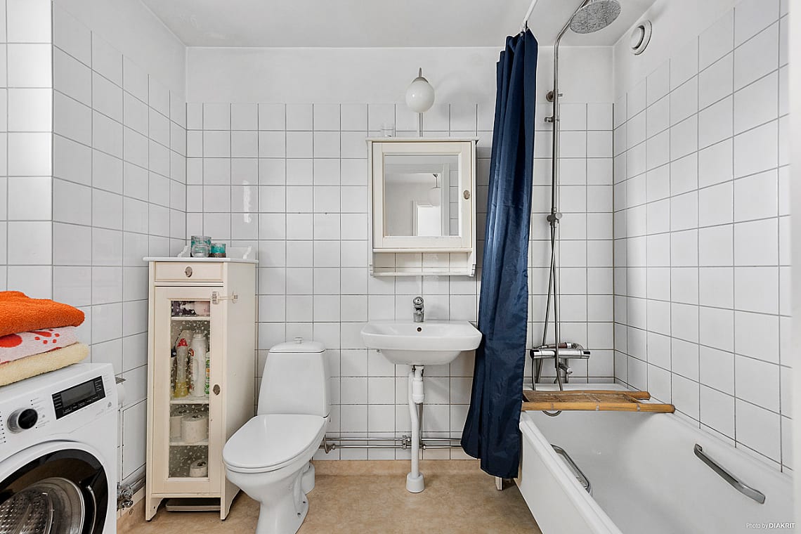 Rymligt badrum med vita kaklade väggar och plastmatta på golvet. Här finns handfat, spegelskåp, WC och badkar. Plats för tvättmaskin för en bekväm vardag. (Tvättmaskin ingår ej i köpet)