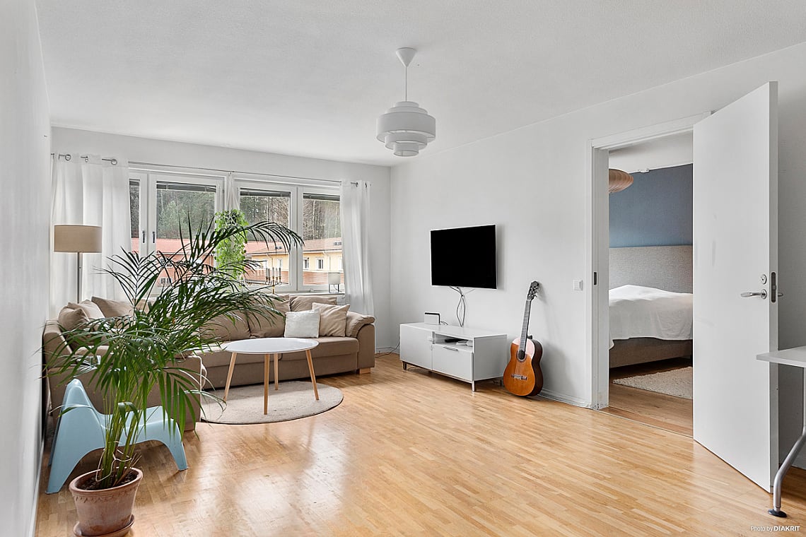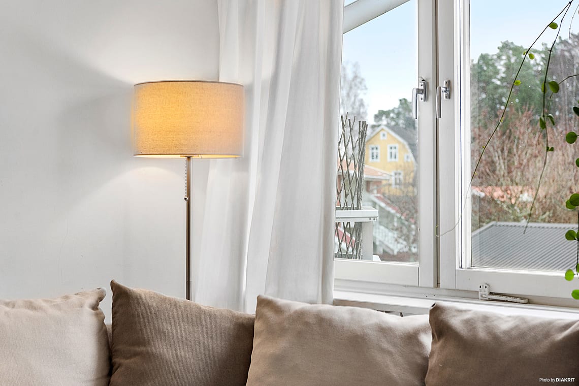 Ljust vardagsrum med stort fönsterparti som släpper in rikligt med ljus. Rummets rymd ger plats för soffgrupp med tillhörande möbler.