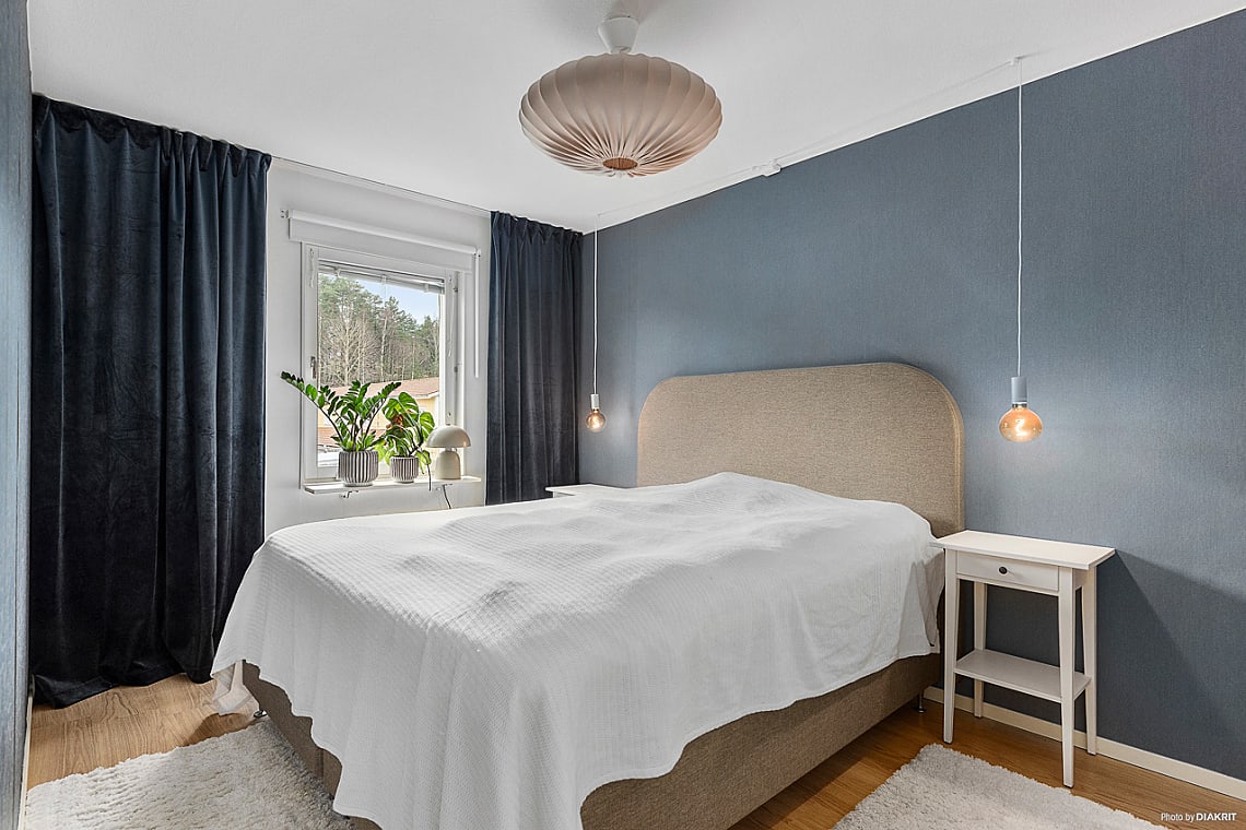 Inbjudande sovrum med plats för dubbelsäng med tillhörande sängbord och förvaringsmöbel.