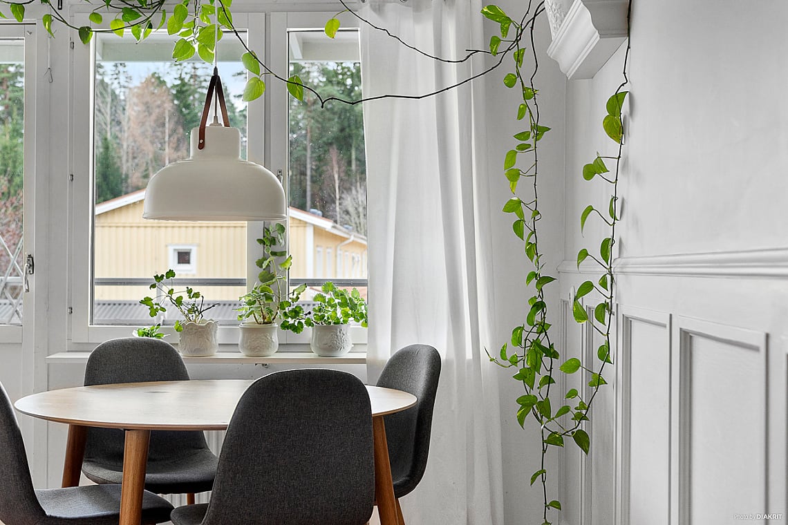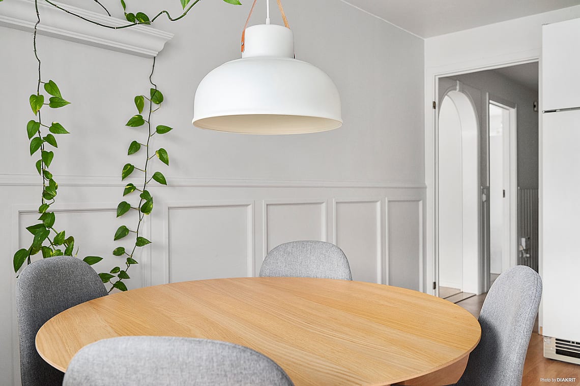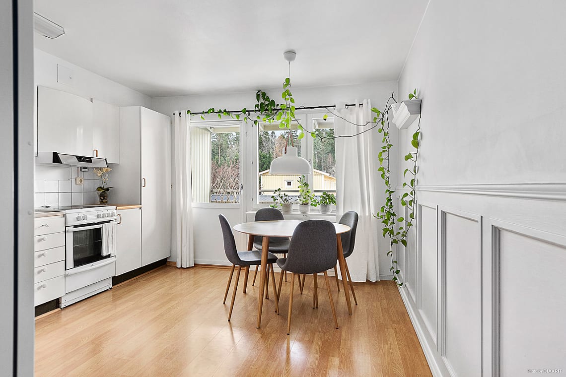Ljust kök med plats för matbord och utgång till bostadens rymliga balkong.