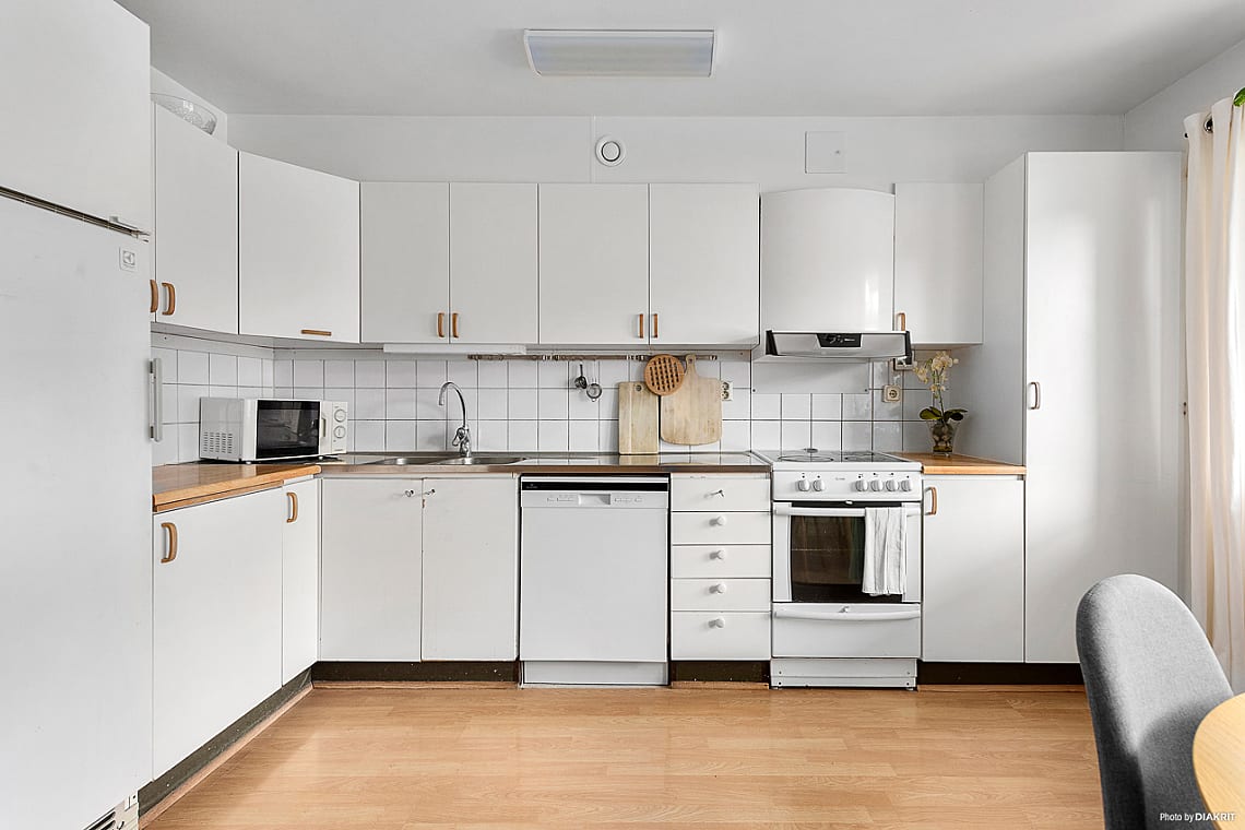 Köket är utrustat med ugn med spishäll, fläkt, diskmaskin samt kyl och frys