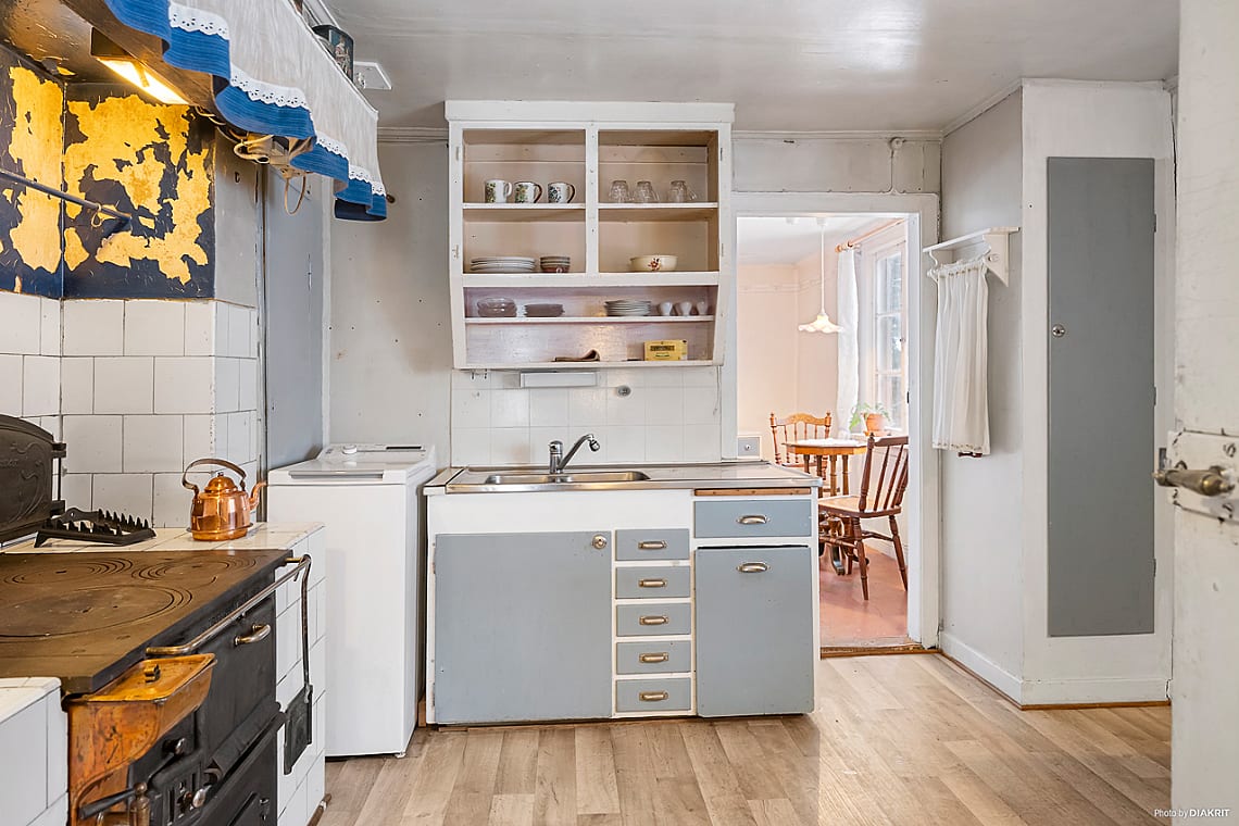 Charmigt och funktionellt kök med plastmatta på golvet och vita väggar som ger en ljus och tidlös bas. De målade kökssnickerierna förstärker den lantliga känslan. Här finns både vedspis och elspis – perfekt för den som uppskattar tradition kombinerat med bekvämlighet. Köket är dessutom utrustat med toppmatad tvättmaskin samt kombinerad kyl/frys.