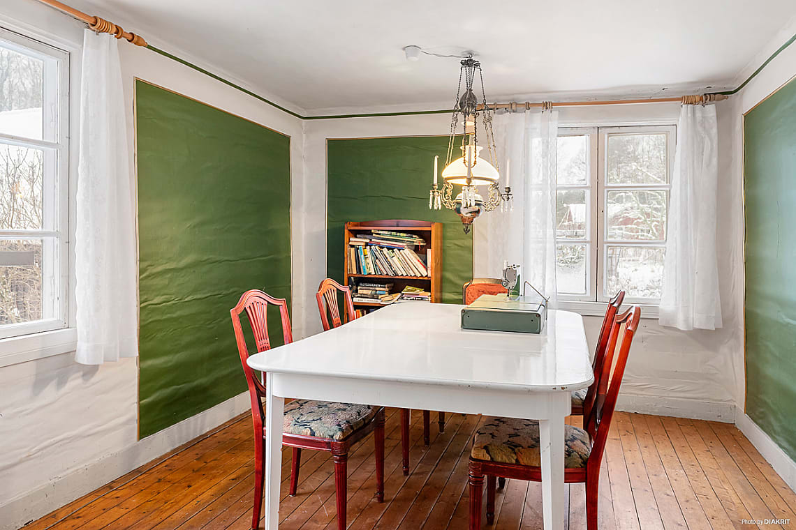 Trivsamt matrum med trägolv och tapetserade väggar. Här finns gott om plats för matbord och stolar, vilket gör rummet idealiskt för både vardagsmiddagar och större sällskap.
