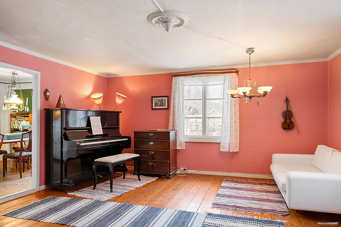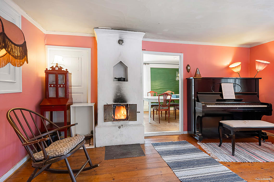 Rymligt vardagsrum med trägolv och rosamålade väggar som skapar en varm och inbjudande atmosfär. Den ståtliga rörspisen blir rummets naturliga blickfång. Här finns generösa ytor för soffa, piano och umgänge.