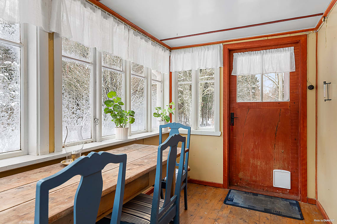 Välkomnande entréveranda med ett härligt ljusinsläpp från spröjsade fönster som ger rummet karaktär och charm. Trägolv samspelar fint med de gula väggarna och skapar en varm första känsla av bostaden.