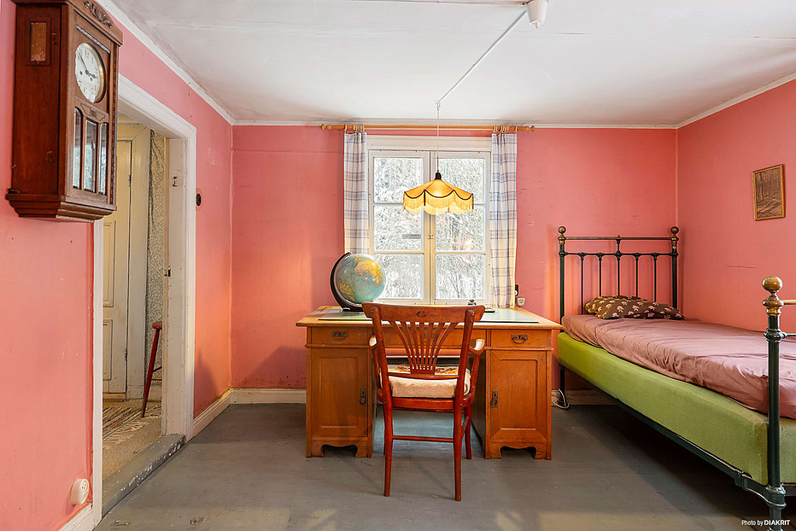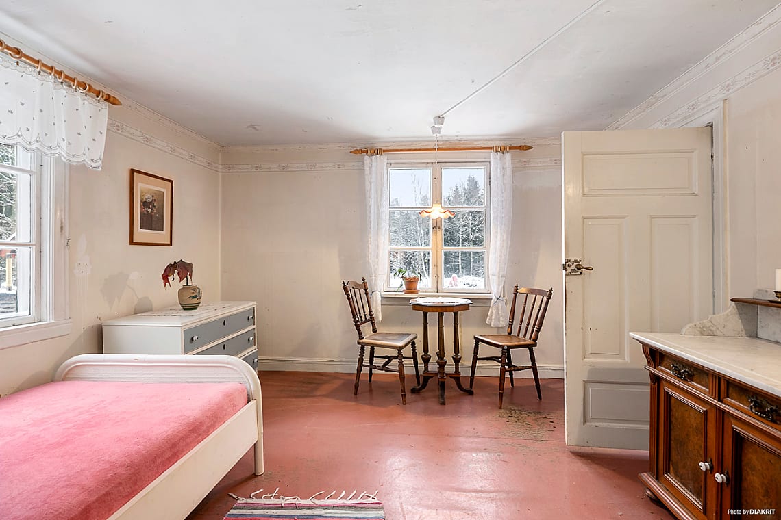 Ljust och trevligt sovrum med rosa golv och ljusa väggar. Här finns plats för säng och förvaringsmöbler. Fönster i två väderstreck ger ett fint ljusinsläpp och en luftig känsla. Rummet värms upp av en gjutjärnskamin.