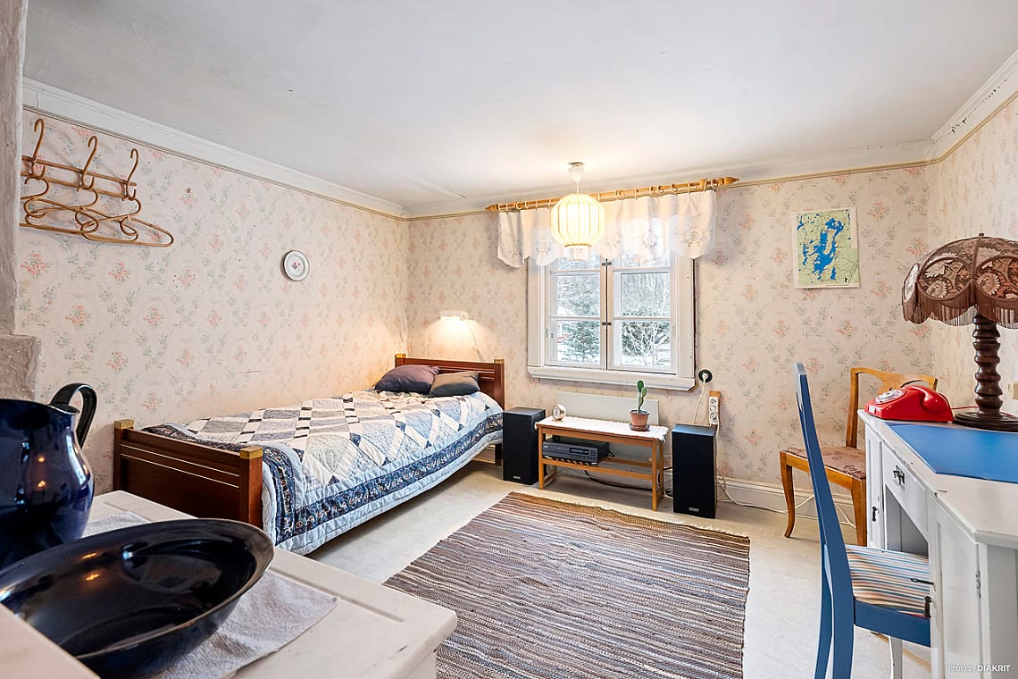 Charmigt sovrum med matta på golvet och tapetserade väggar med blommotiv. Ett rofyllt rum med plats för säng, skrivbord och förvaringsmöbel – perfekt som master bedroom, gästrum eller barnrum. En rörspis skapar värme och trivsel.
