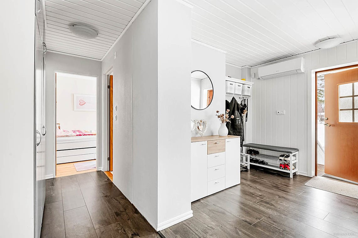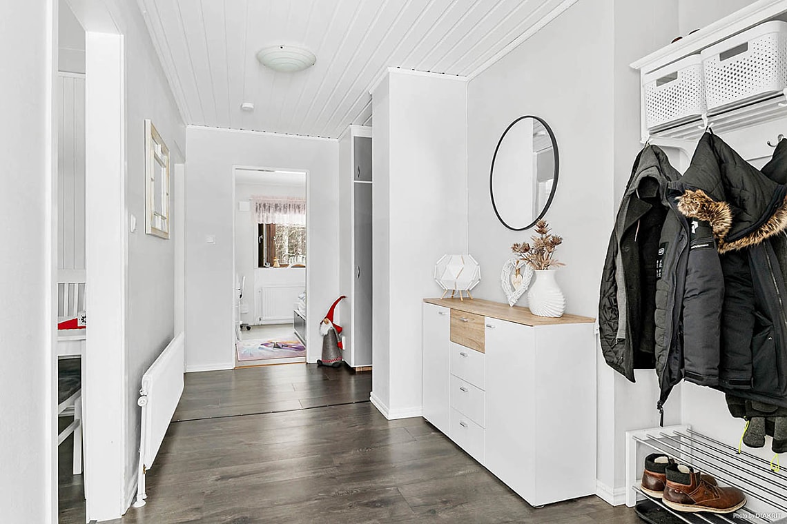 Välkomnande hall med plats för avhängning av kläder och skor. Ljusa väggar bidrar till en trivsam känsla.