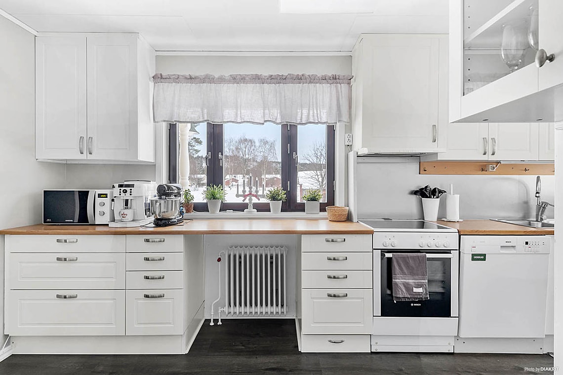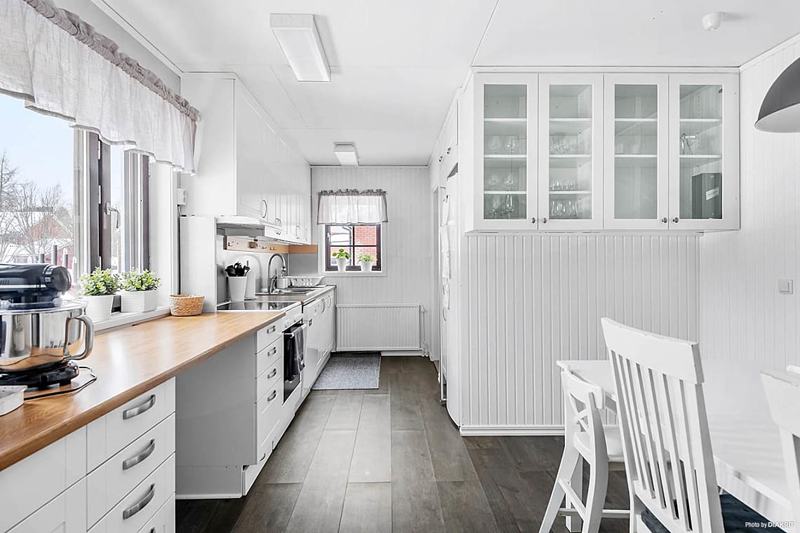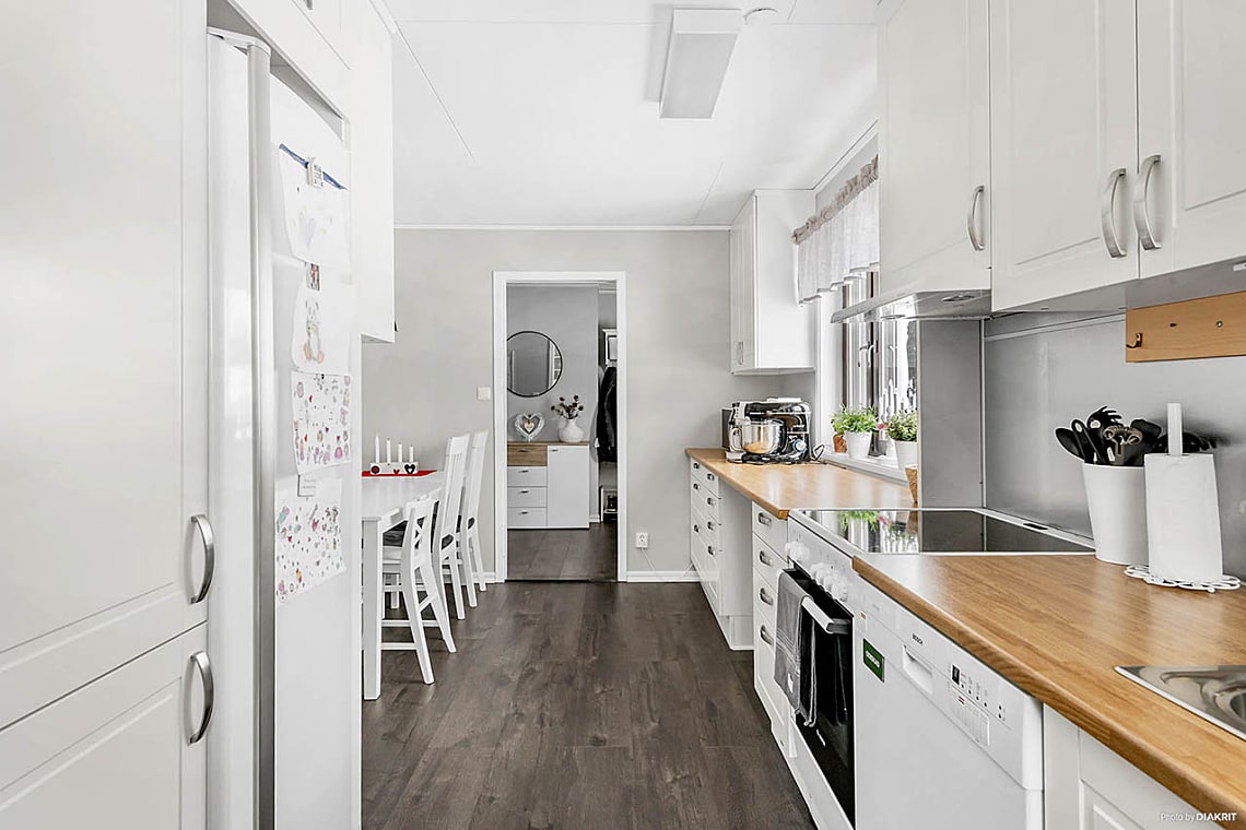 Rymligt kök med gott om arbetsyta och förvaring bakom ljusa köksluckor. Köket är utrustat med spis, ugn, fläkt samt kyl och frys. Plats finns för ett mindre matbord.