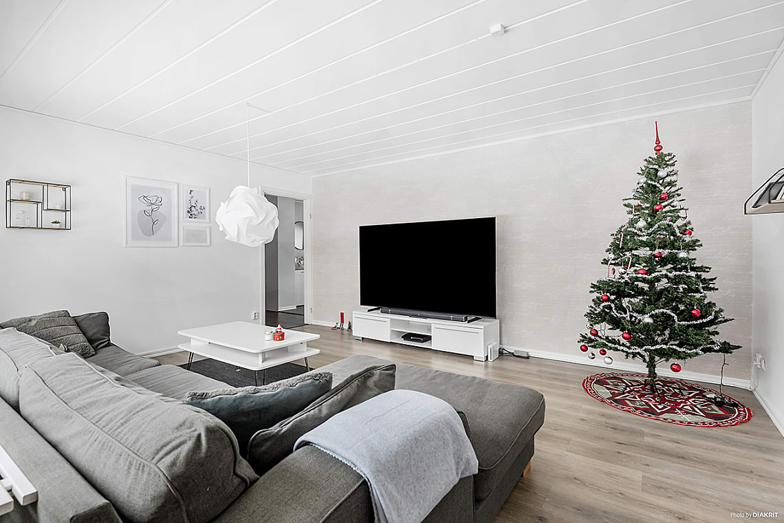 Ljust och rymligt vardagsrum med flera fönsterpartier som ger ett fint ljusinsläpp. Här finns utgång via altandörr till uteplatsen samt gott om plats för soffgrupp och tillhörande möbler.