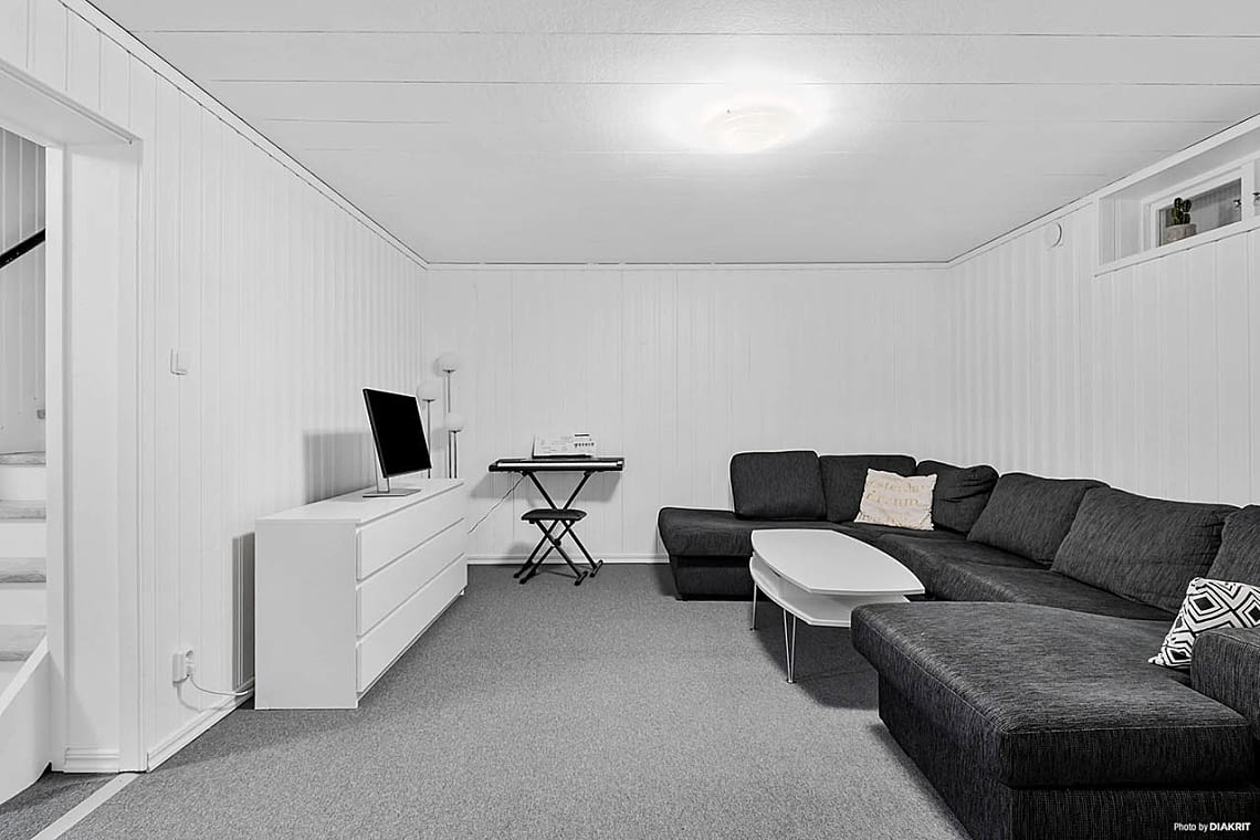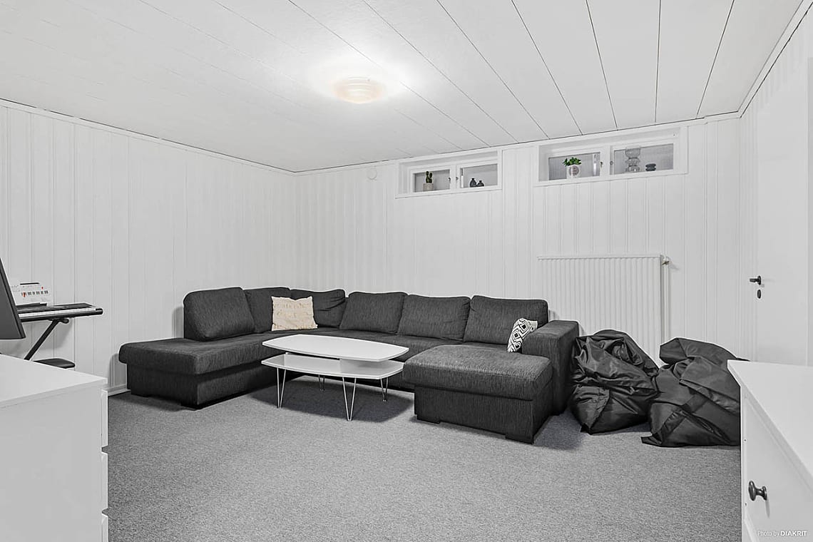 Källaren rymmer dessutom ett allrum med plats för soffgrupp och tillhörande möbler.
