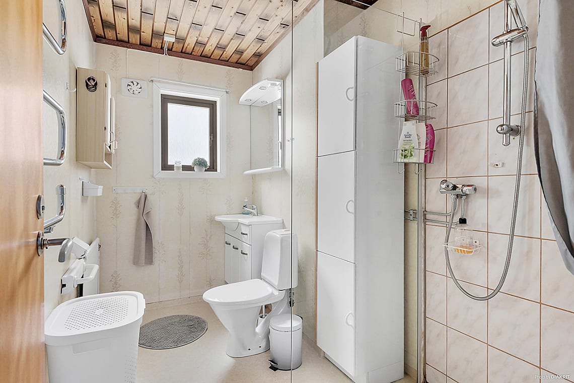 Ljus toalett med våtrumsmatta och våtrumsväggar samt kaklad duschvägg. Utrustad med dusch, wc, handfat och spegel.
