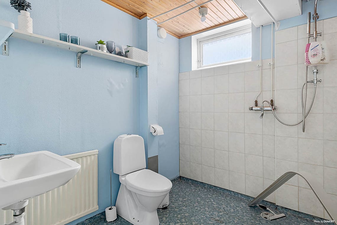 Ljust badrum med våtrumsmatta och våtrumsväggar samt kaklad duschvägg. Här finns dusch, wc, handfat och spegel.