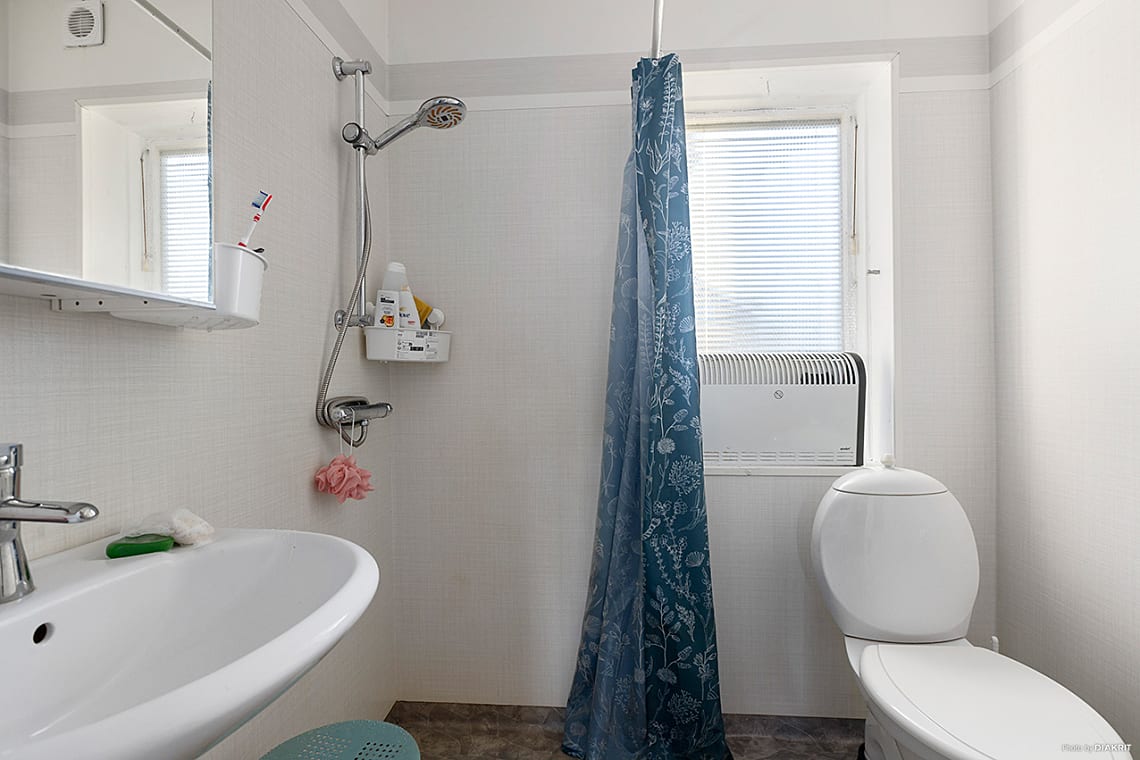 Här finns handfat, spegelskåp, WC och dusch. Fönster för ljusinsläpp och vädring.