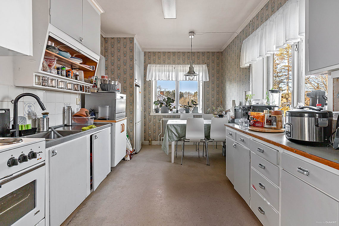 Huset har ett visst behov av renovering och uppfräschning, vilket ger köparen möjlighet att sätta sin egen prägel och utveckla bostaden över tid.