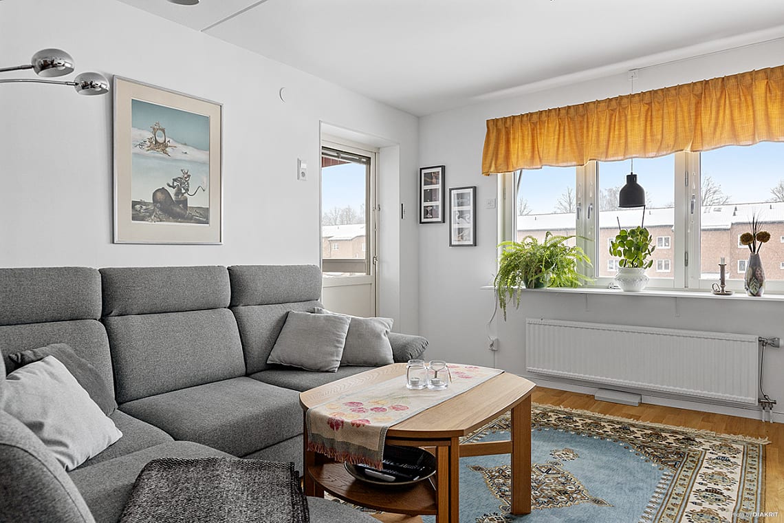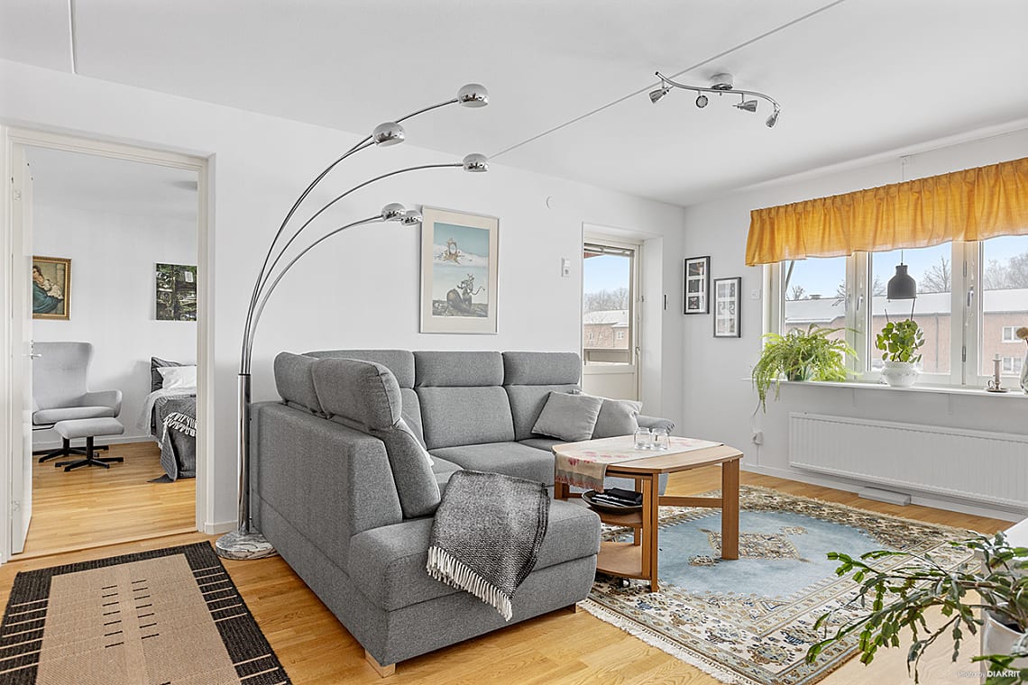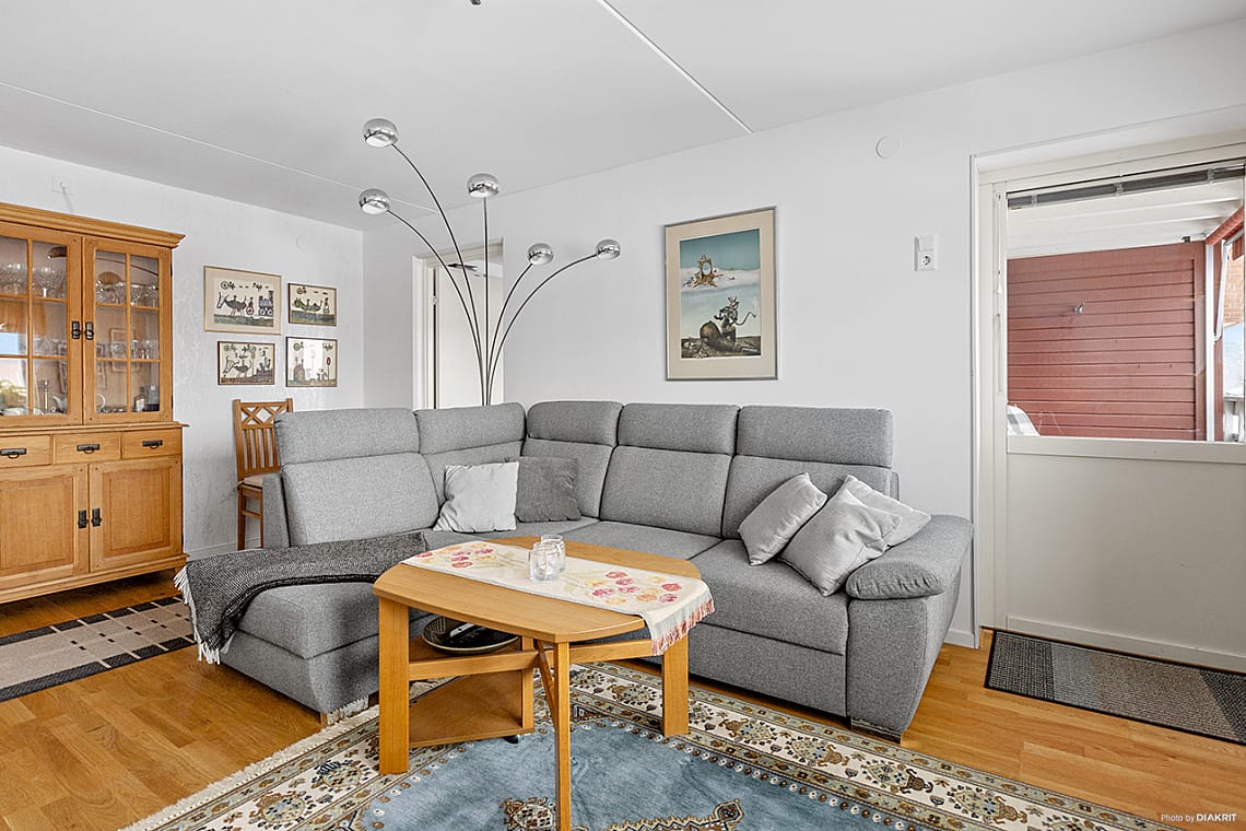 Rymligt vardagsrum med parkettgolv och tapetserade väggar. Här ryms en större soffgrupp och umgänge i en trivsam miljö. Från rummet nås den härliga balkongen i soligt söderläge, utrustad med stor eldriven markis som ger skön skugga under varma dagar.