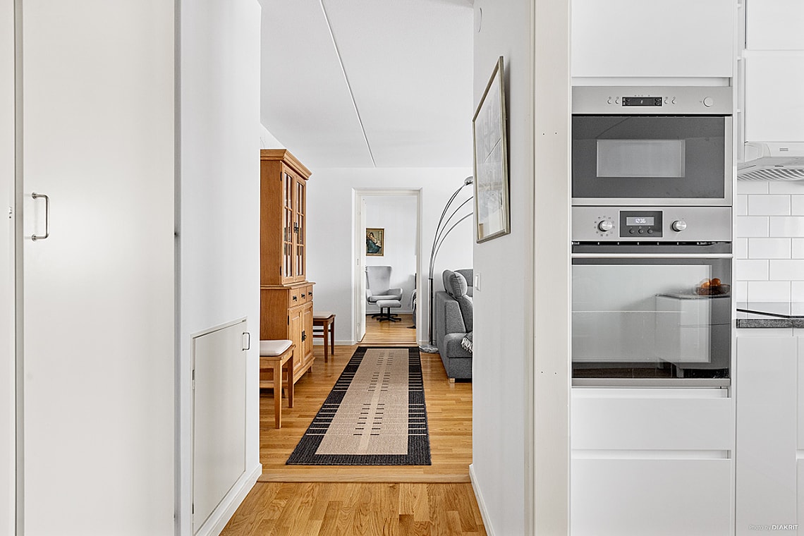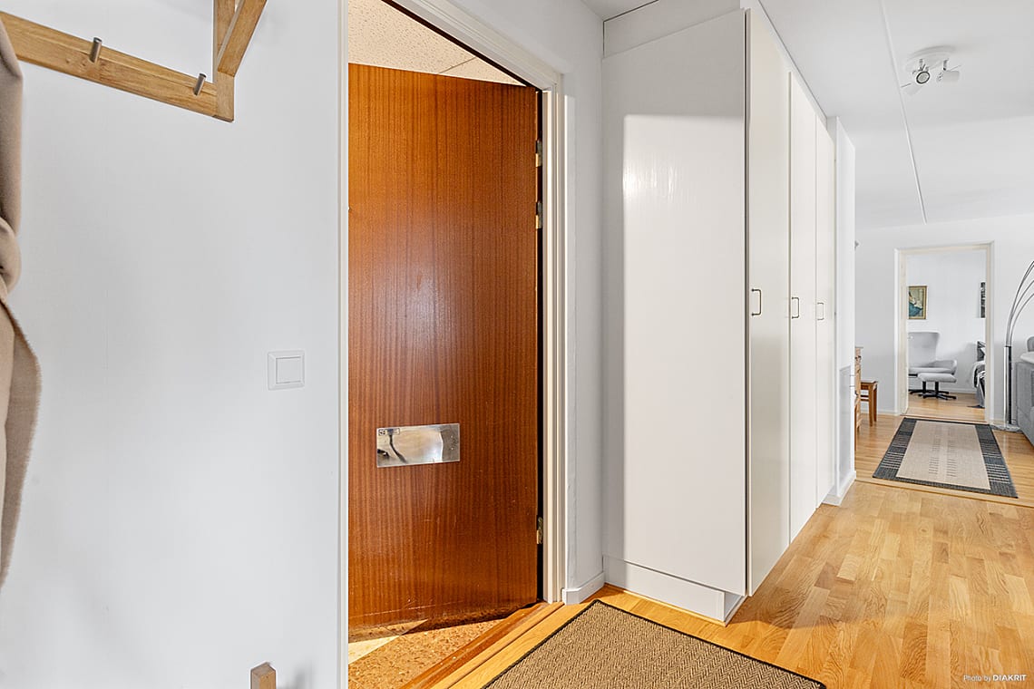 Välkomnande hall med stilrent parkettgolv och tapetserade väggar. Goda förvaringsmöjligheter i form av två praktiska garderober och ett städskåp.