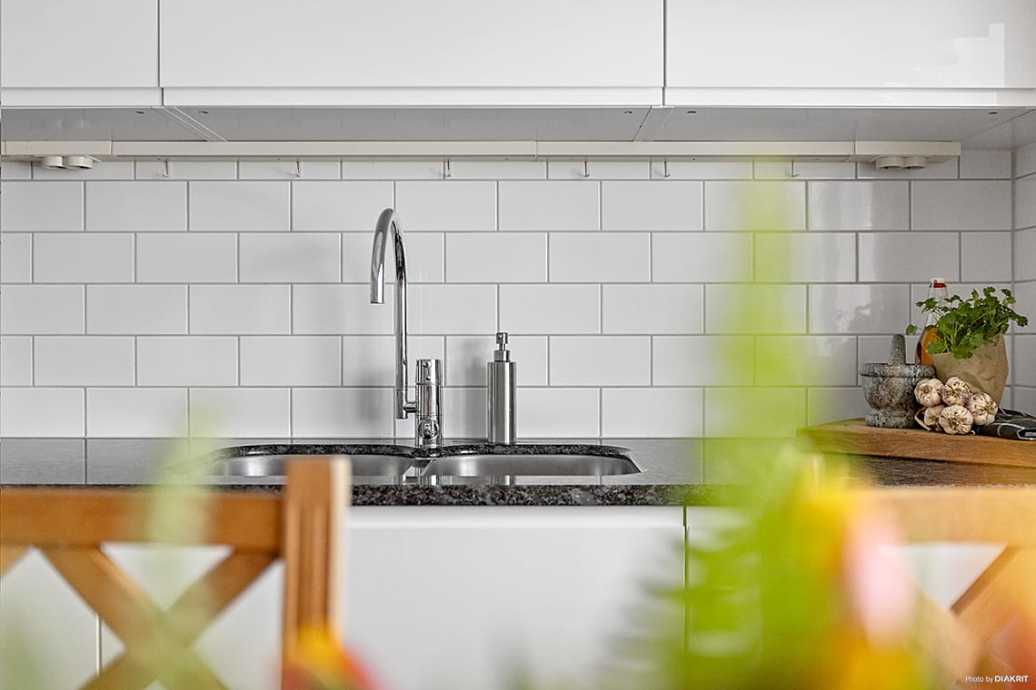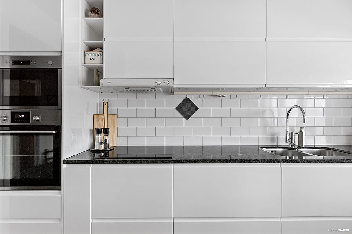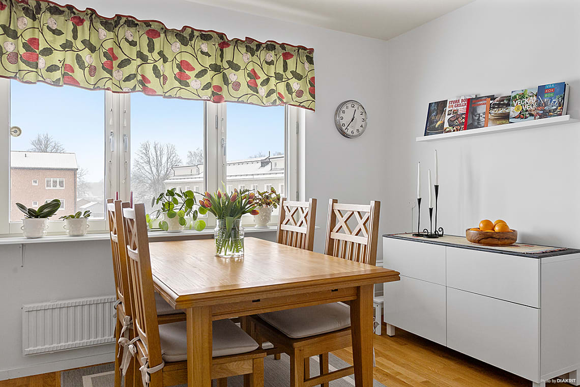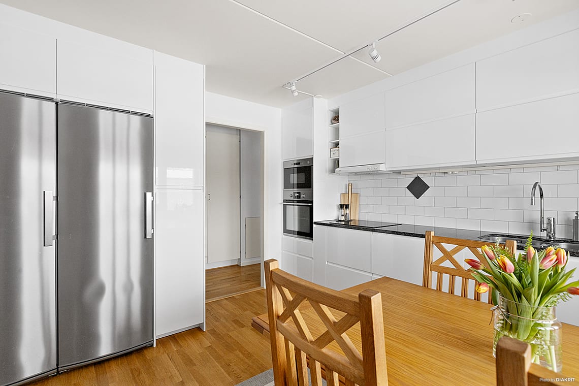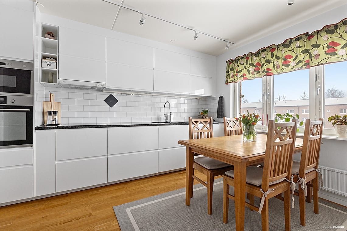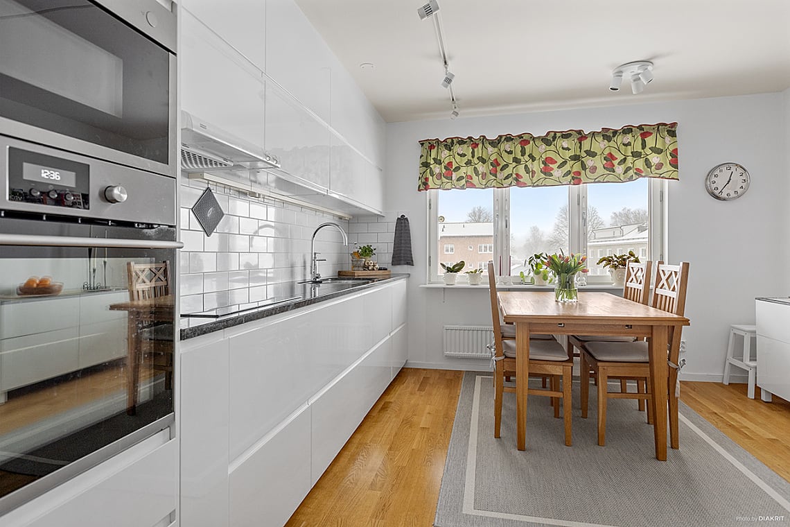 Ljust och trivsamt kök med parkettgolv och tapetserade väggar. Stilrent vitt IKEA-kök med generösa arbetsytor och gott om förvaring. Fullt utrustat med induktionshäll, fläkt, diskmaskin, inbyggd mikro och ugn samt kyl och frys i full storlek. Här finns även plats för matgrupp – perfekt för både vardag och middagar med vänner.