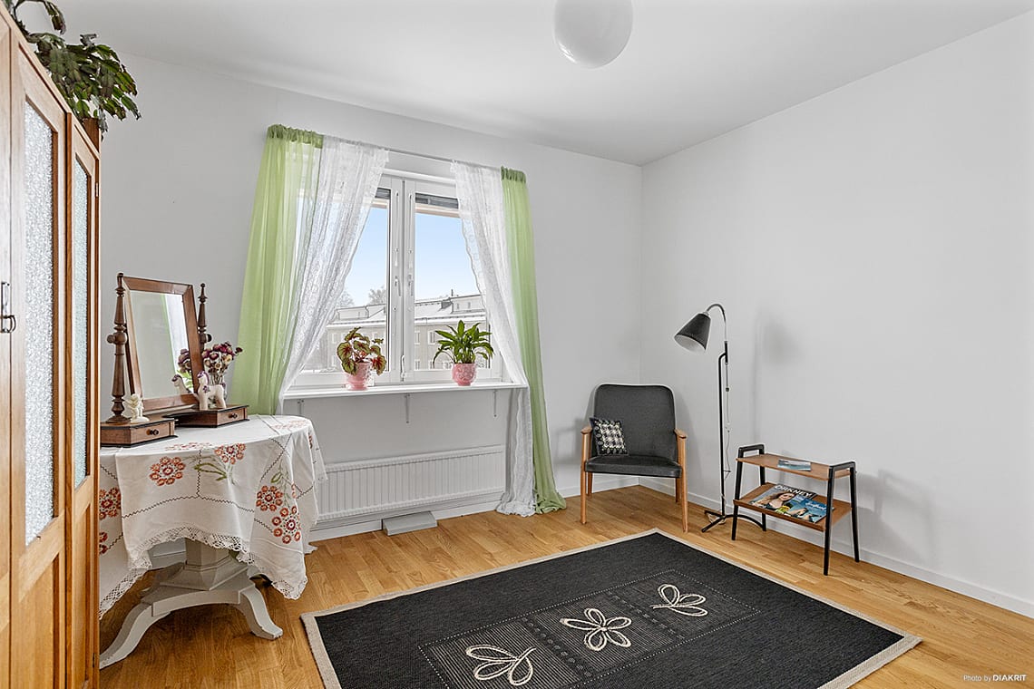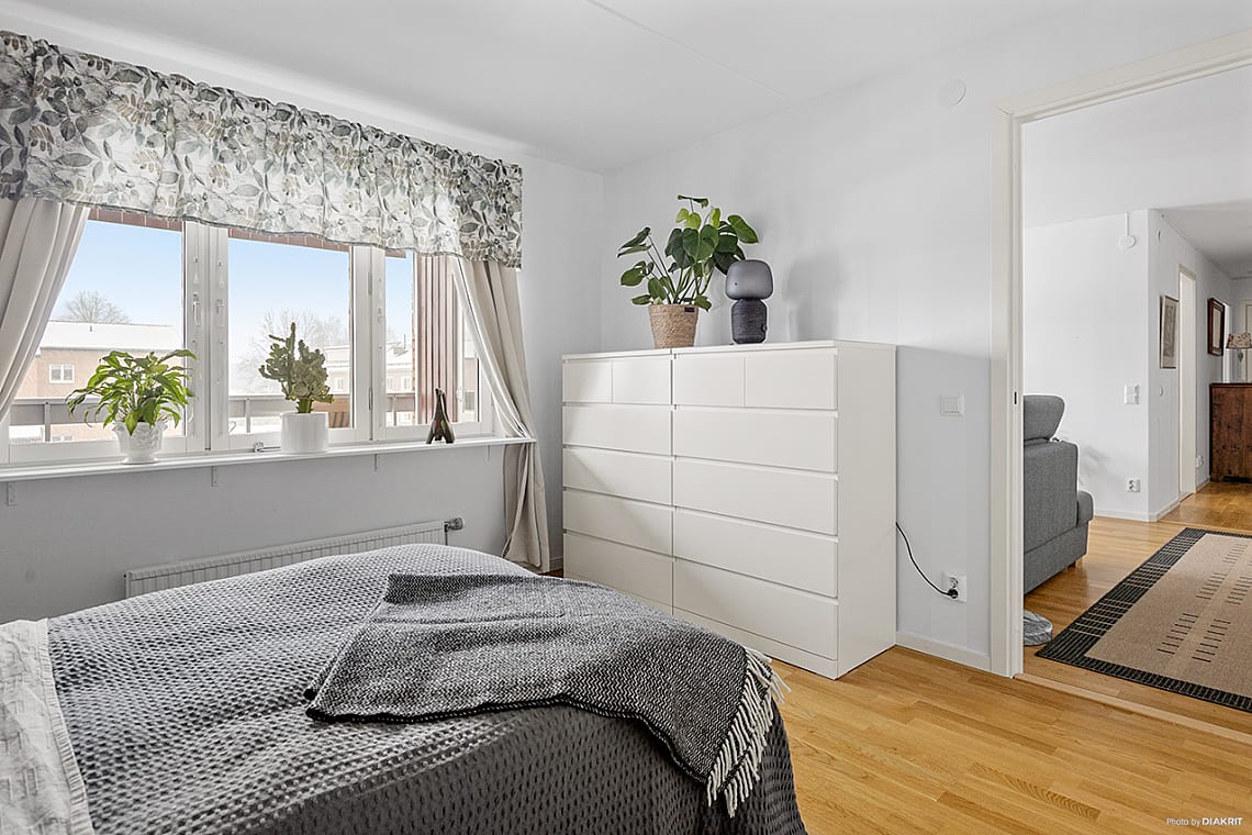 Flexibelt sovrum med parkettgolv och tapetserade väggar. Två enkelgarderober erbjuder bra förvaring och rummet har plats för en större säng. Fönster mot balkongen ger fint ljusinsläpp och en lugn känsla.