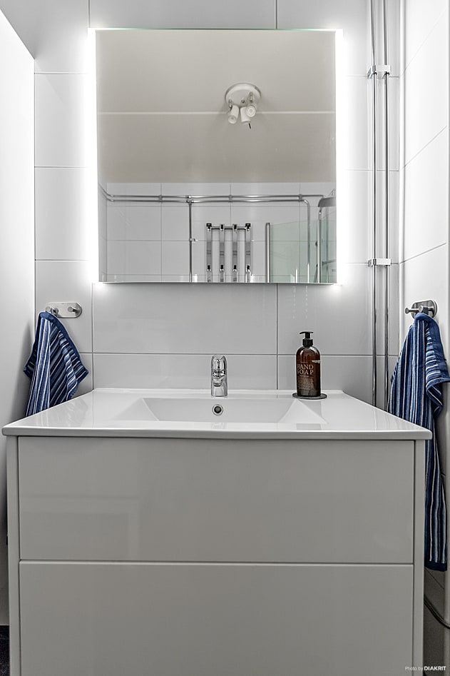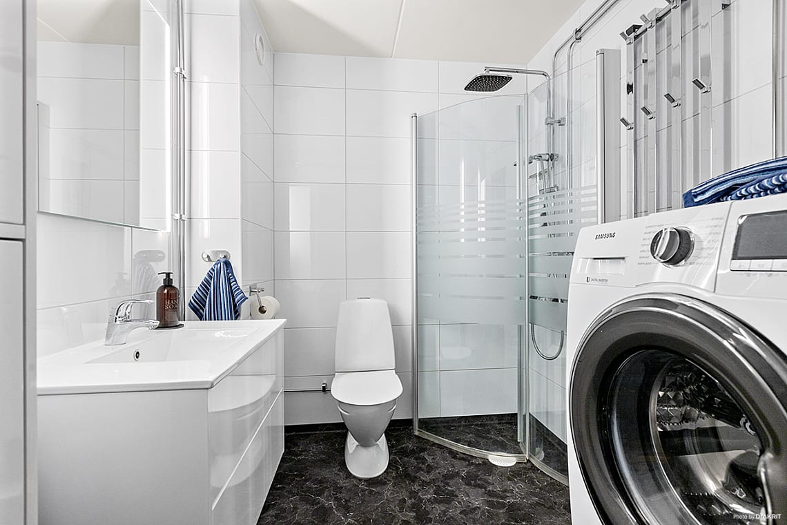 Redan i hallen möts du av goda förvaringsmöjligheter i två garderober. Det fräscha badrummet är helkaklat och utrustat med handfat med kommod, spegel, badrumsskåp, WC samt dusch med vikväggar. Här finns även egen tvättmaskin som förenklar vardagen.