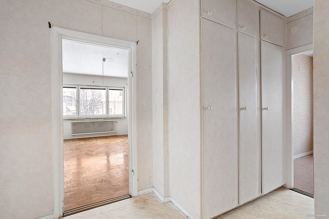 Välkomnande hall med plats för avhängning samt gott om förvaring i flera garderober. Plastmatta på golvet och tapetserade väggar ger en praktisk och funktionell entré till bostaden.