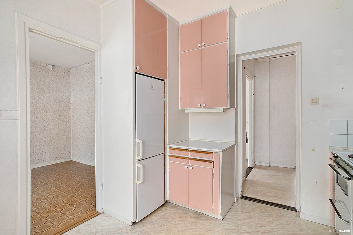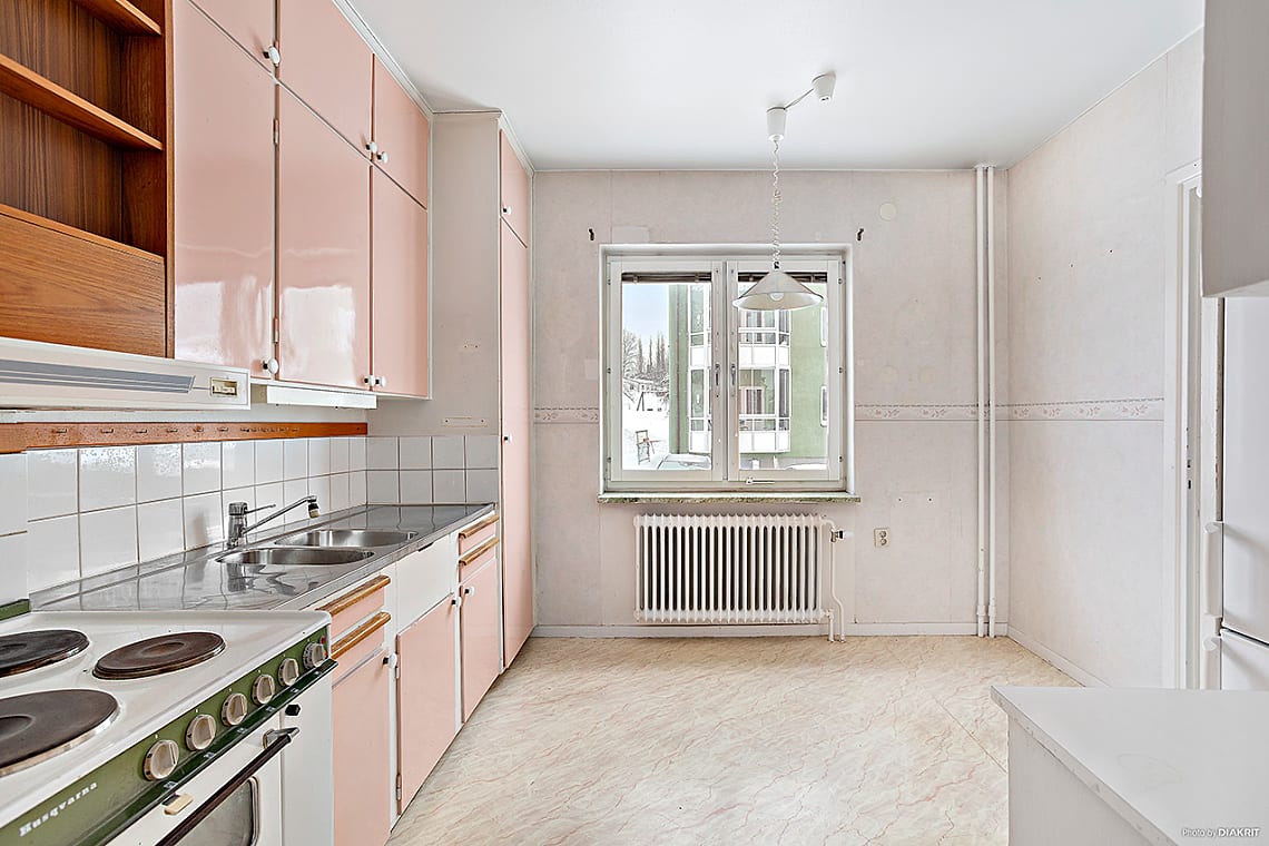 Charmigt kök med plastmatta och tapeter samt rosamålad skåpsinredning i originalutförande. Här finns spis med ugn, fläkt, kryddhylla samt kombinerad kyl och frys. Köket erbjuder goda arbetsytor och bra förvaringsmöjligheter, perfekt för både vardagsmatlagning och bakning.