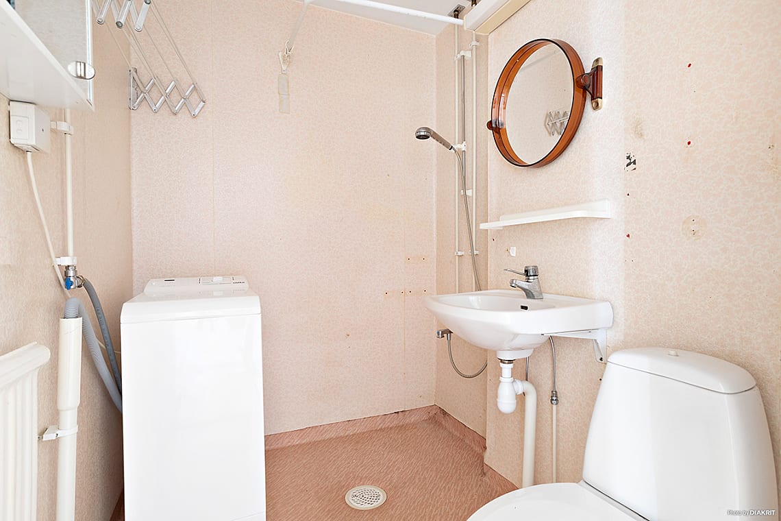 Badrum med våtrumsmatta och våtrumstapet. Utrustat med wc, handfat, dusch, spegelskåp, handdukstork samt toppmatad tvättmaskin – ett praktiskt och funktionellt badrum.