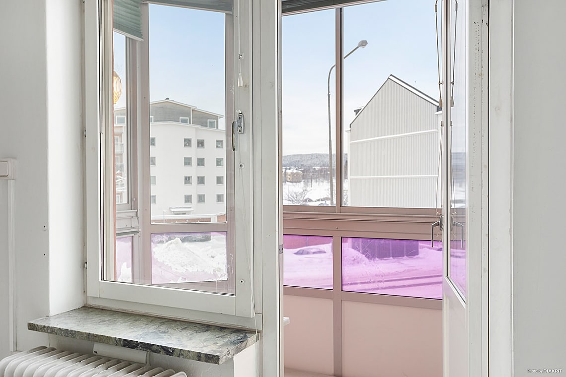Lägenheten har fönster i tre väderstreck vilket skapar ett fantastiskt ljus hela dagen. Den inglasade balkongen ligger i bästa eftermiddags- och kvällssolläge – en perfekt plats för avkoppling större delen av året. Takhöjden bidrar till en luftig känsla och planlösningen är både praktisk och flexibel.