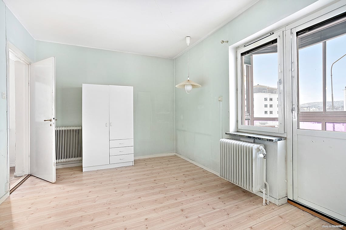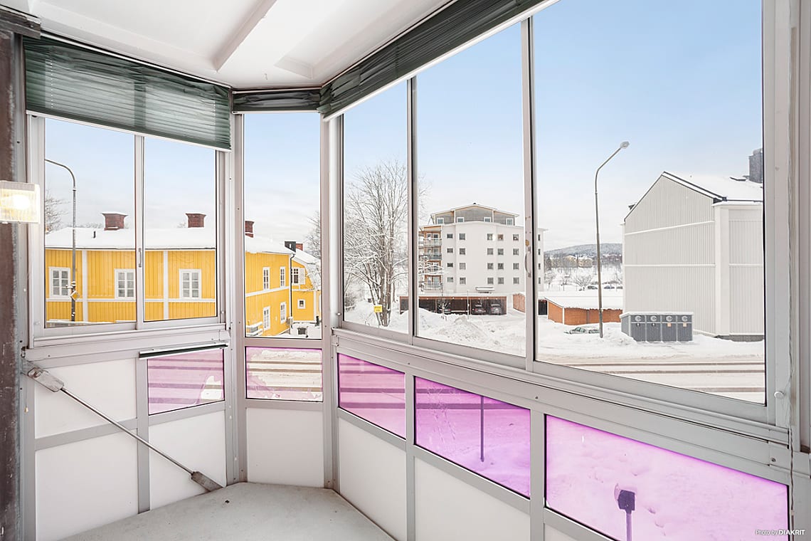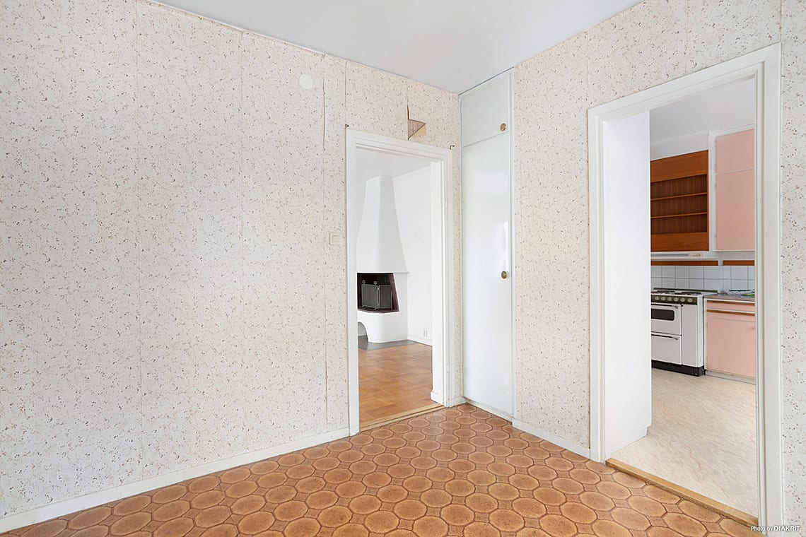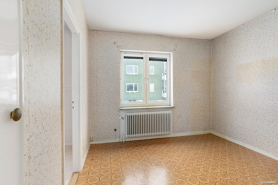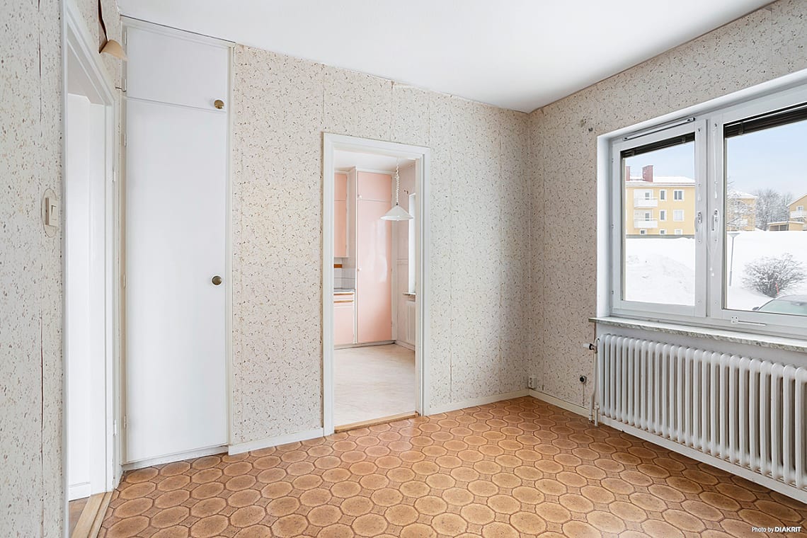 Flexibelt rum som kan anpassas efter behov – matrum, extra vardagsrum eller sovrum. Plastmatta och tapeter samt ett praktiskt inbyggt linneskåp. Dubbelfönster bidrar till fint ljusinsläpp.