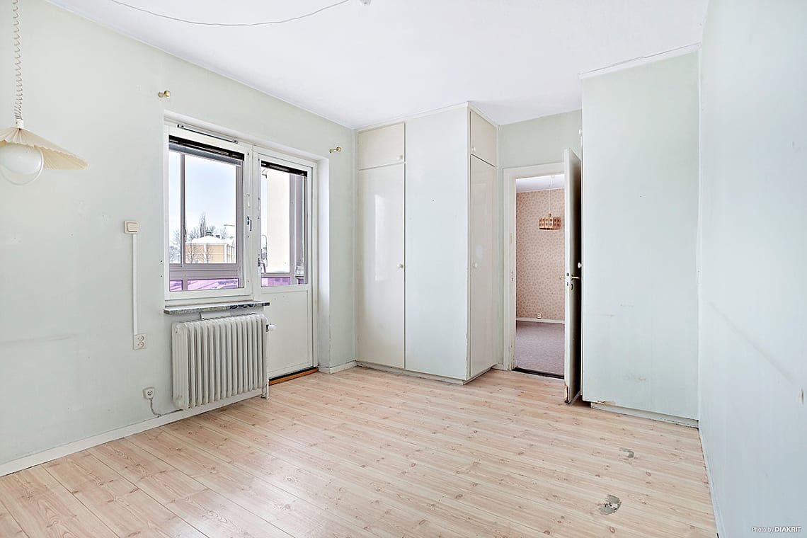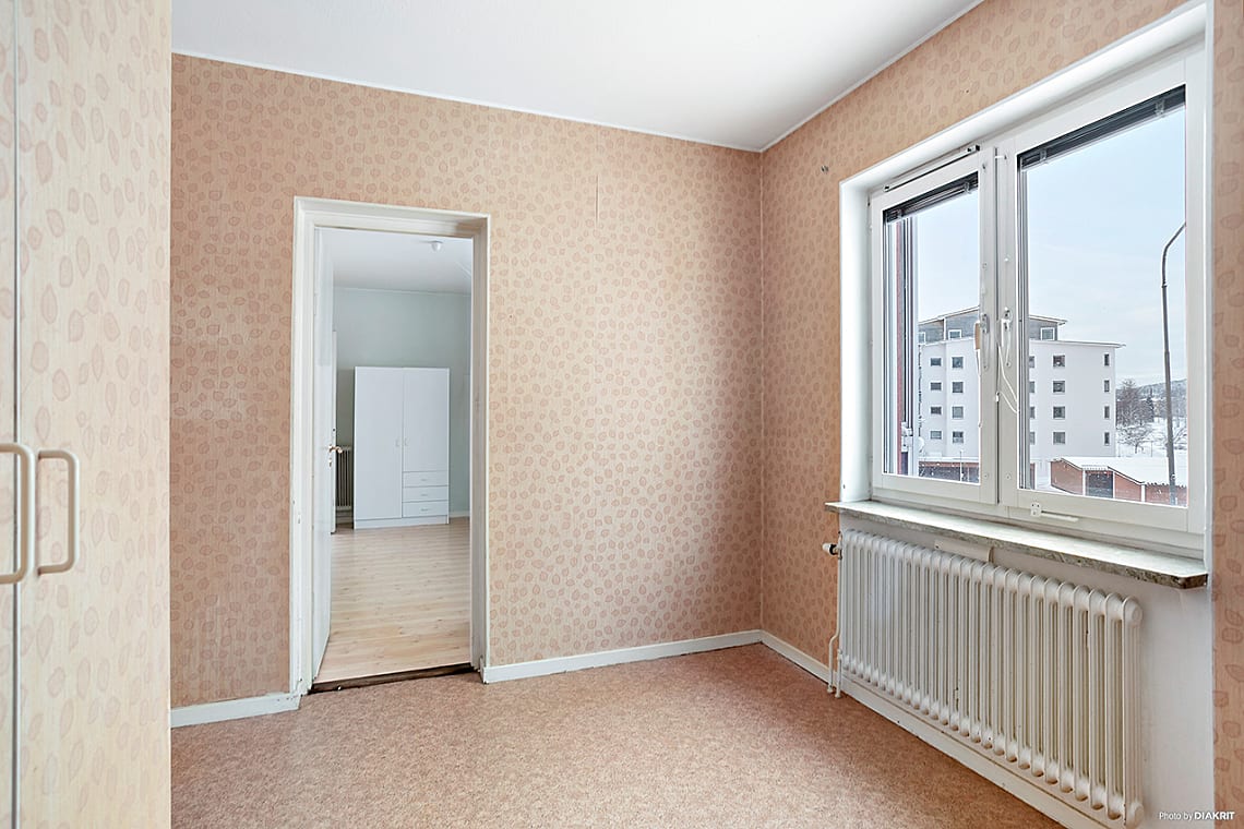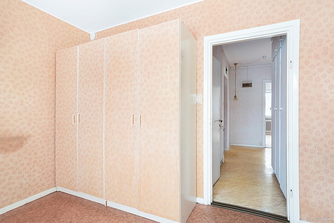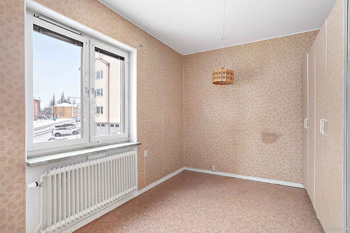 Sovrum med plastmatta och tapetserade väggar. Plats för säng och skrivbord, vilket gör rummet lämpligt som barnrum, gästrum eller hemmakontor. Goda förvaringsmöjligheter.