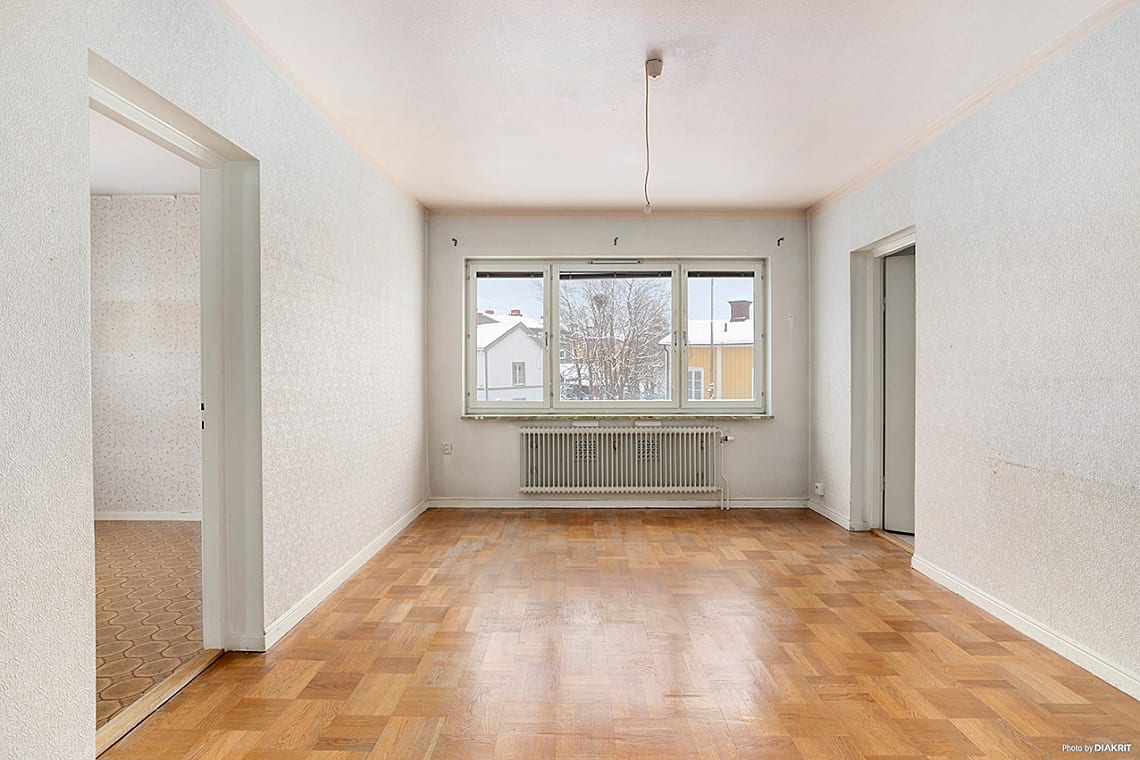 Ljust och trivsamt vardagsrum med parkettgolv och tapetserade väggar. Här finns gott om plats för soffgrupp, tv-möbel och övrig möblering för sociala tillfällen.