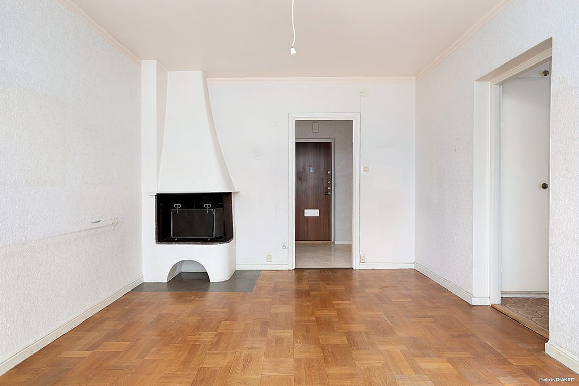 Gavellägenhet med öppen spis, inglasad balkong och originalkök