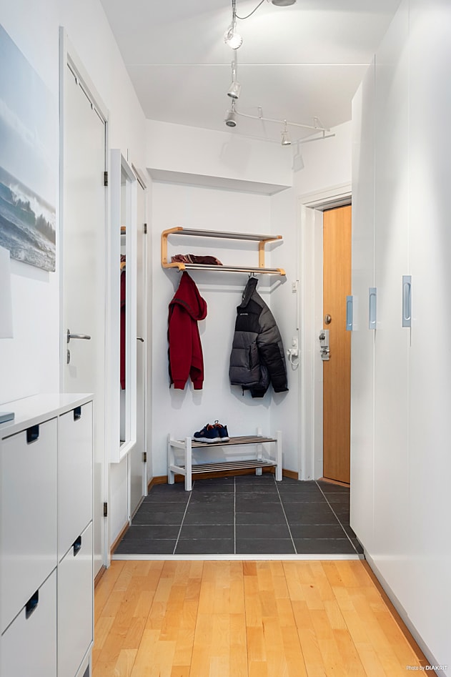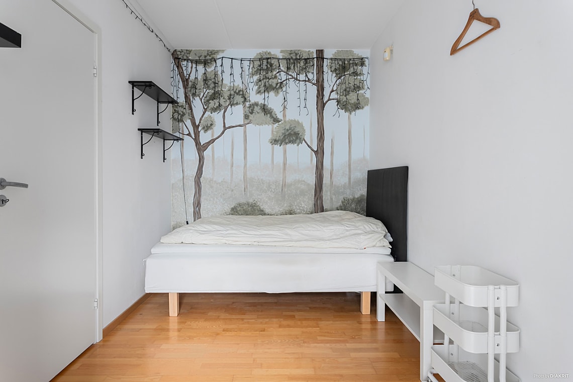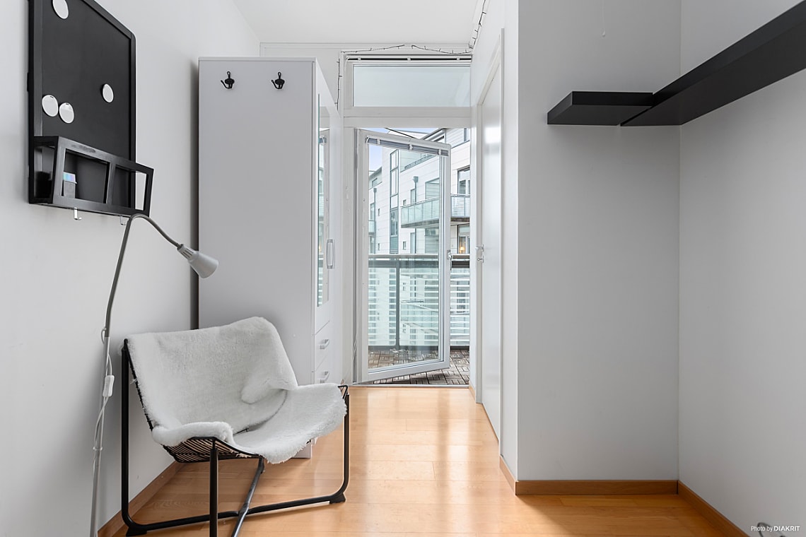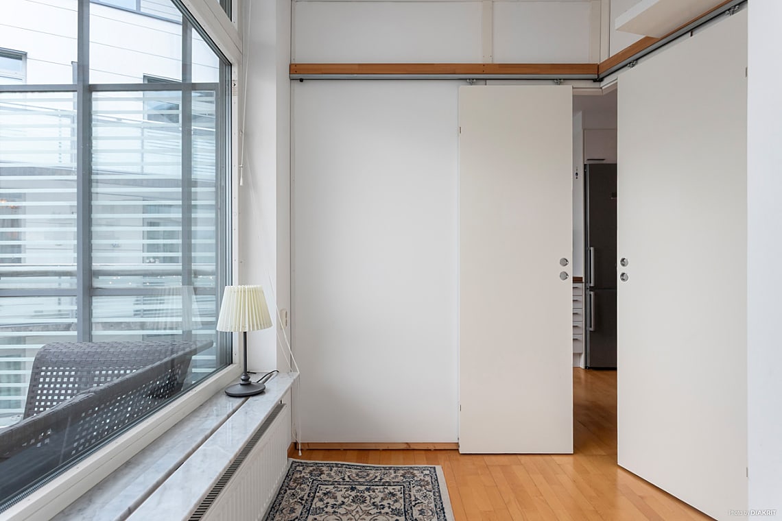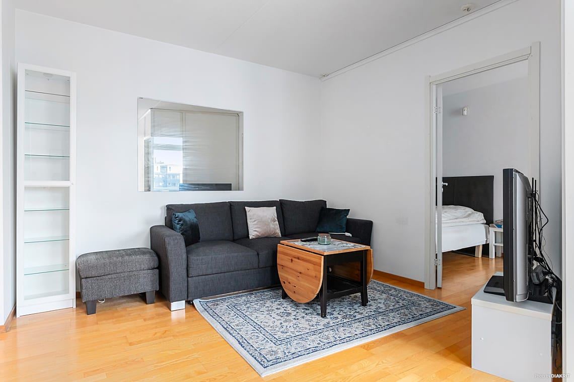 Lägenheten är i grunden en välplanerad etta men är idag smart ombyggd och disponerad med två sovalkover, varav det ena är ett mindre rum med skjutdörrar. De uppsatta väggarna är spända mellan golv och tak och kan enkelt tas bort för den som önskar en mer öppen planlösning. Det helkaklade badrummet håller god teknisk standard och är utrustat med praktisk tvättpelare.