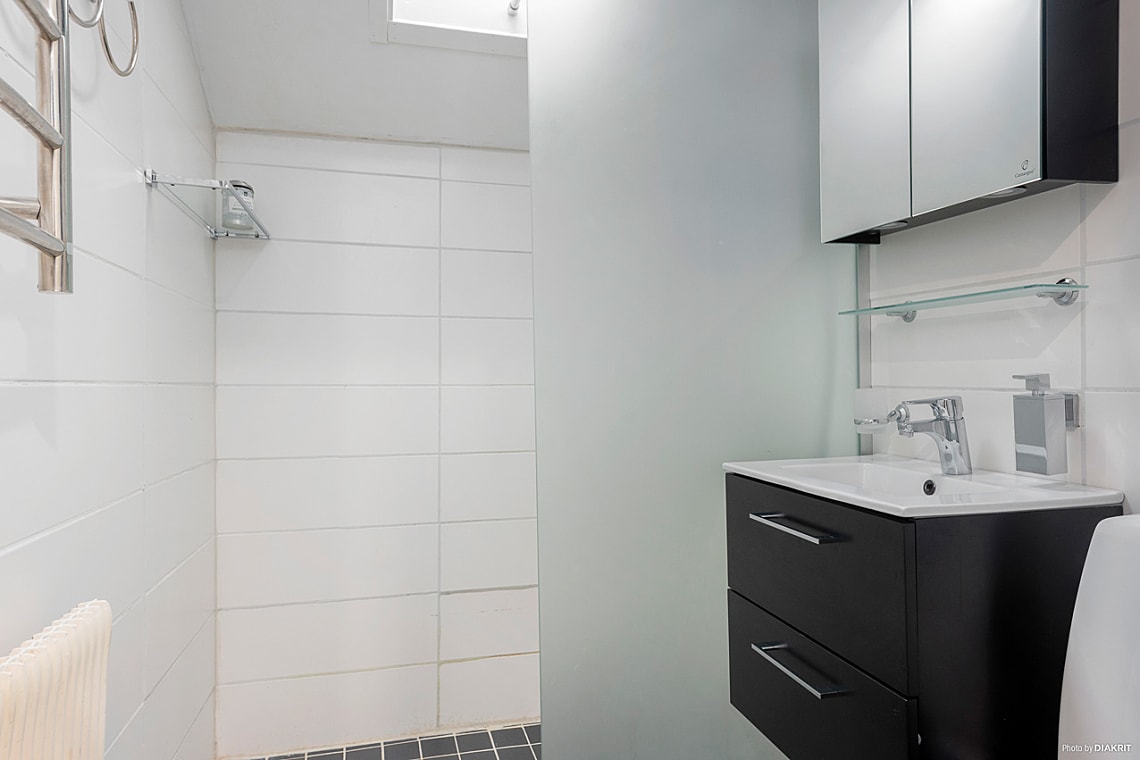 Helkaklat badrum med vita kaklade väggar och mörkt klinkergolv. Här finns handfat i kommod, spegelskåp, WC och dusch.